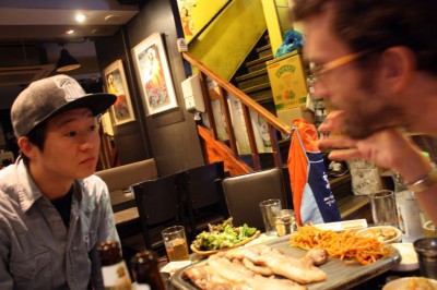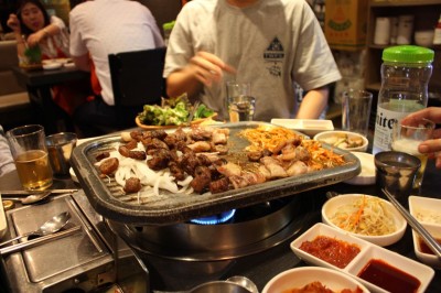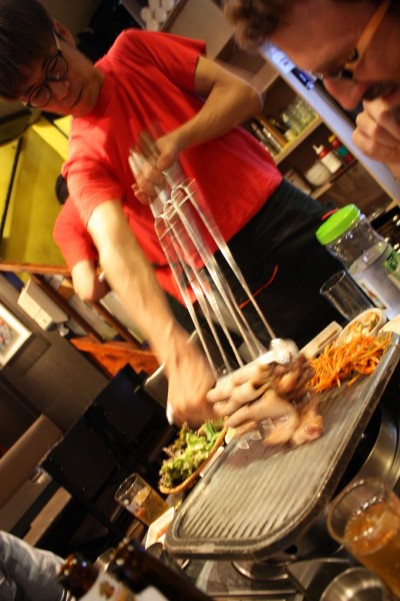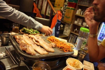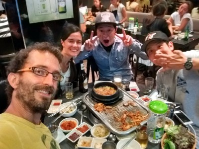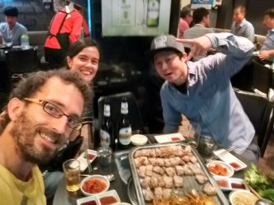 Corean BBQ, riquísima. Pedro descubre cómo se llama la salsa de tomate coreana que tanto le gusta: ssamjang. Yumiii. 🙂 Nuestro menú: intestinos de buey, sopa pescado y cerdo a la barbacoa. Delicioso. Cervezas Cass para que pase todo mejor. Antes de empezar a zampar, se nos une su amigo Jay.