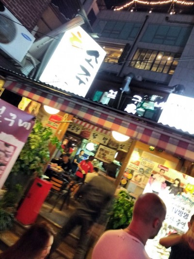 Después de la súper comilona, toca hacer la digestión. Un pub cercano será el lugar escogido. Yo me pido una Desperados y Pedro algunas cervezas Alley Kat (cerveza de Edmonton, Canadá). Hablamos un montón. Sobre Asia, Europa, España y Corea. Sobre Julio Iglesias, Gangnam Style, Samsung, Ragonat, el idioma, la comida y de la influencia en Corea, de Japón y China.  Aprendimos que Kakao, Line y Naver, son coreanas. Estuvimos muy a gusto. Muchas gracias amigos coreanos.
