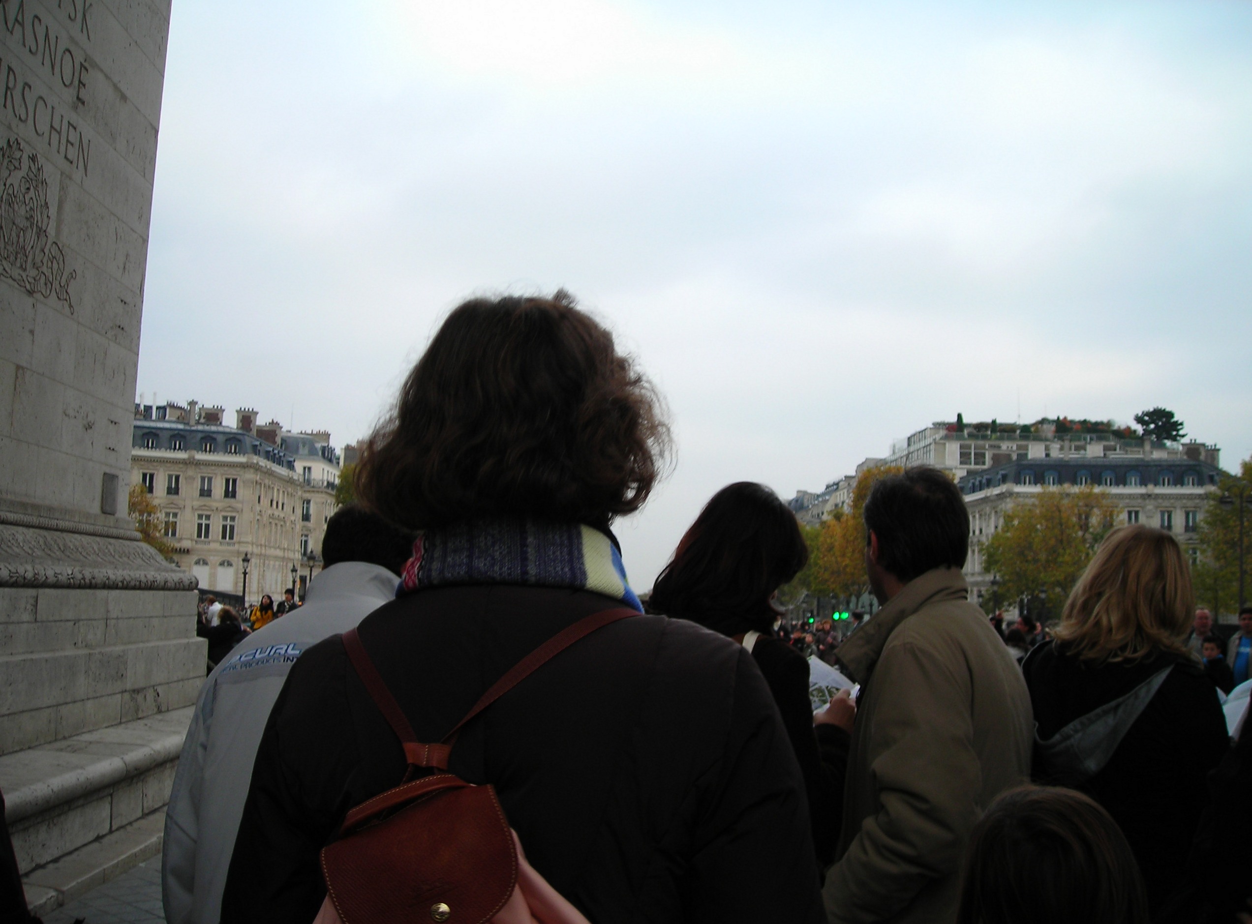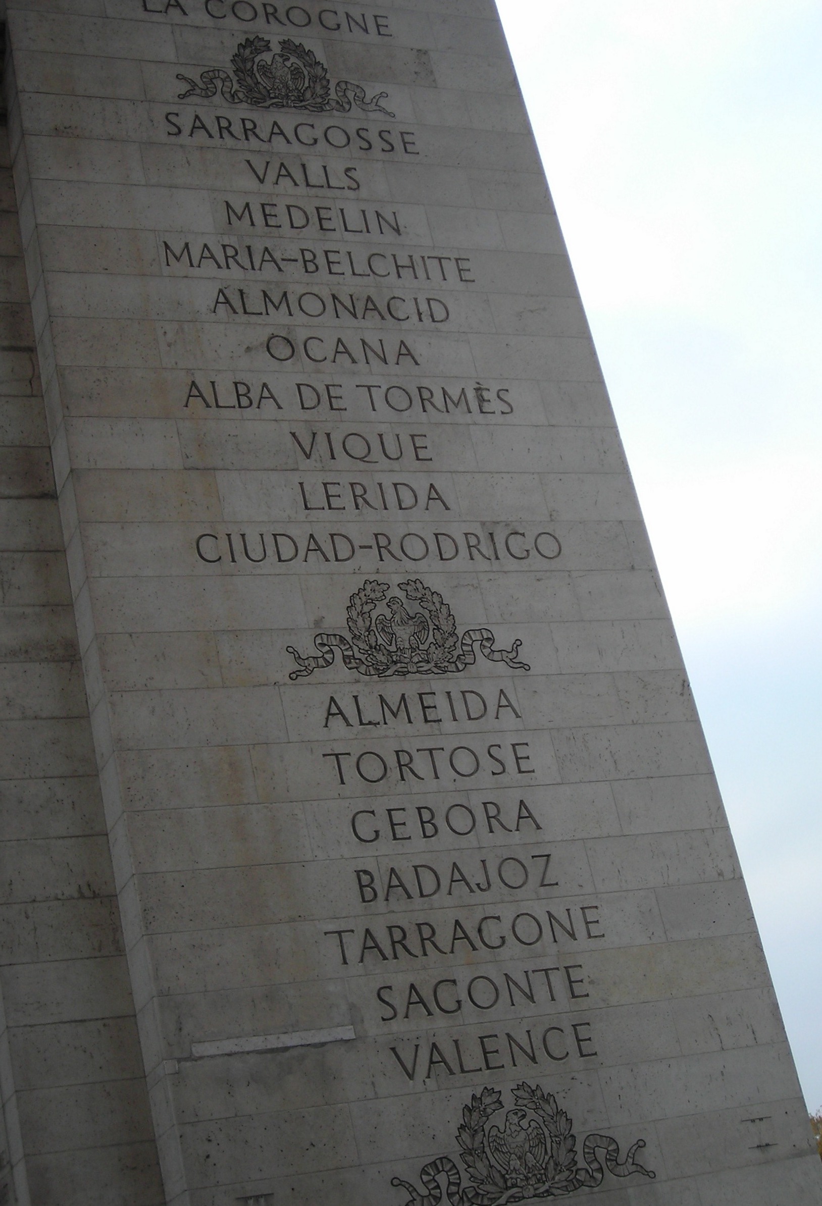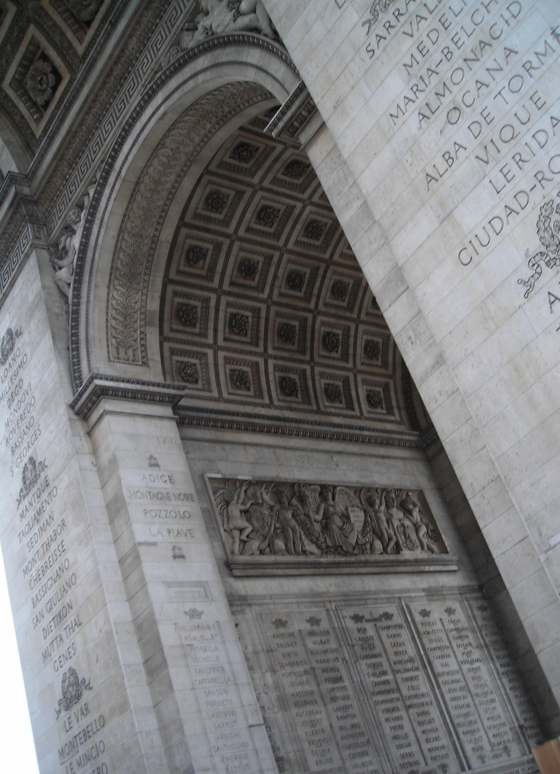 Llegamos al Arco del Triunfo y subimos. Lo que más nos enganchó no fueron los altorrelieves de la fachada sino los nombres grabados en el interior de los pilares: campañas y batallas napoleónicas. Yo me quedé parado un rato en «Ciudad Rodrigo,» que había estado hacía un par de años —una de las pocas que aparecen como derrota francesa— porque es donde Wellington le cortó las alas a Napoleón en la Guerra de la Independencia española. Saber que ese topónimo concreto está esculpido en el monumento más imperial de París tiene algo de simétrico y de inesperado.