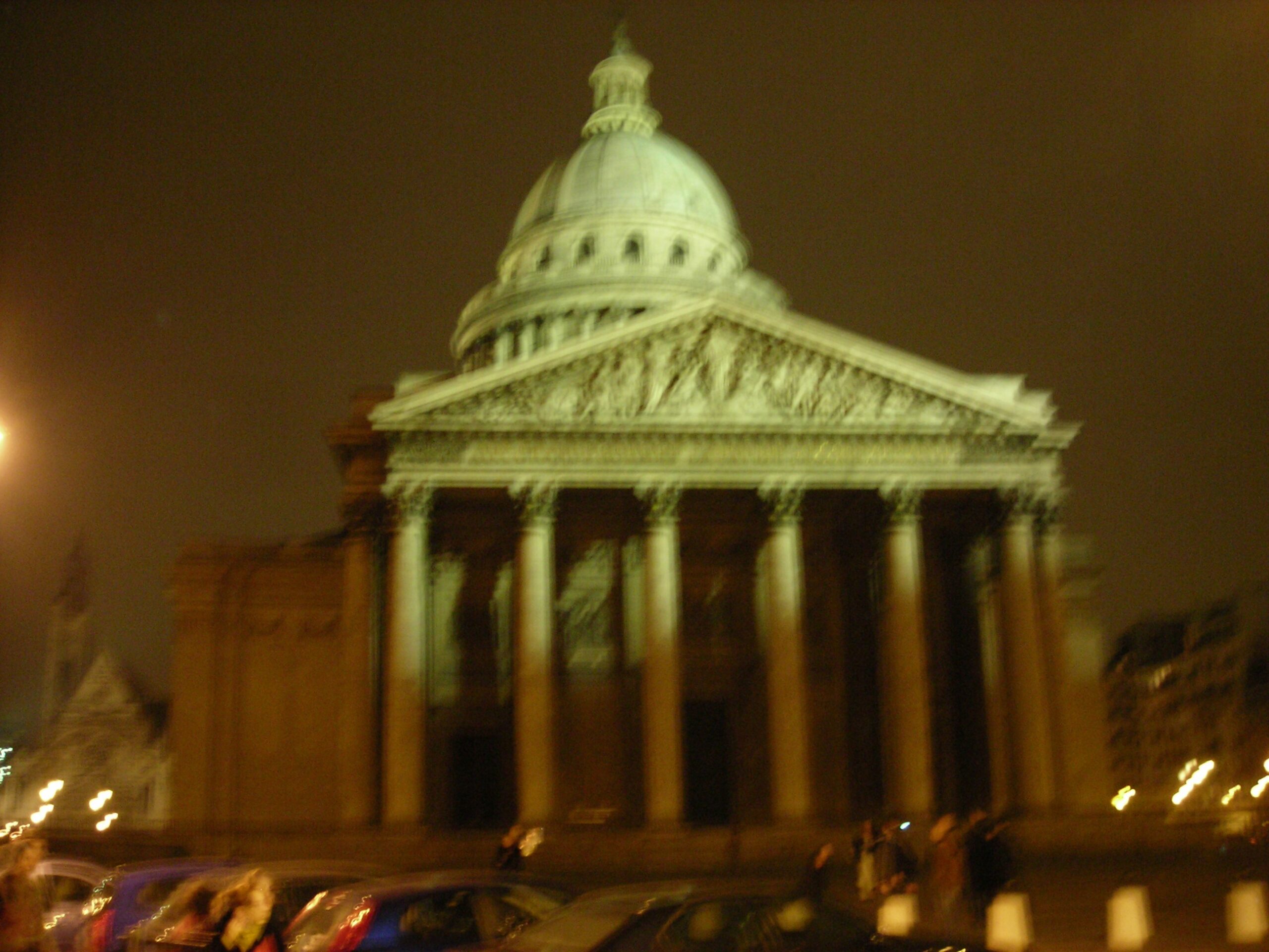 Cuando volvimos a salir ya empezaba a oscurecer. Bajamos andando hasta la Place de la Concorde —obelisco de Lúxor en medio, los caballos alados de las dos fuentes encendidos, el reloj imperial de la noche parisina ya en marcha— y de ahí, tras un metro corto, llegamos al Quartier Latin y al Panthéon. Está en lo alto de la Montagne Sainte-Geneviève, al final de la Rue Soufflot, y aunque el nombre nos lleva mentalmente a Roma, este es el primo neoclásico francés: lo proyectó Soufflot en el XVIII como iglesia de Santa Genoveva, la Revolución lo convirtió en mausoleo laico de la patria, fue iglesia otra vez con la Restauración, mausoleo otra vez con la Tercera República, y desde 1885, cuando enterraron a Victor Hugo, el sitio se quedó como panteón civil para siempre. No recuerdo que entráramos