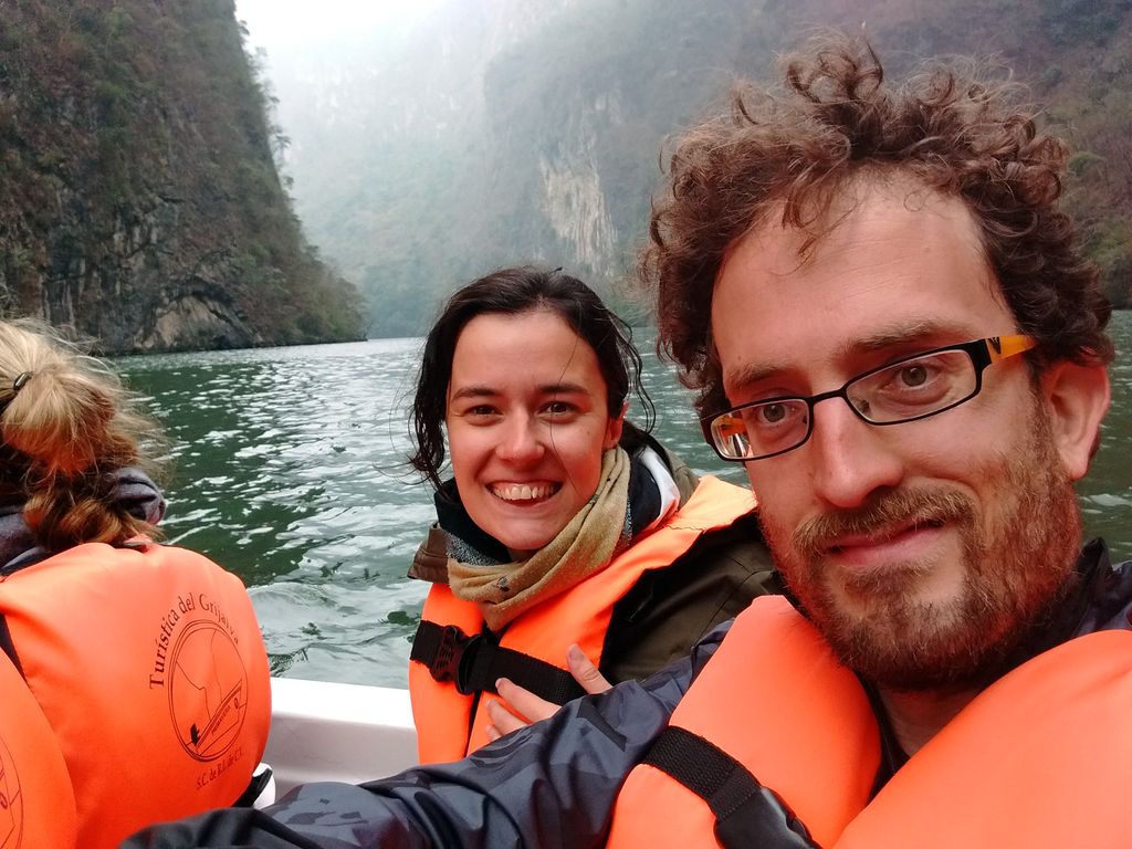 Chalecos salvavidas y a bordo. 😉 El cañón es espectacular. Para mí, el día nublado lo hace todavía más bonito. Nos llueve algo durante el trayecto que nos llevará 84 kilómetros y dos horas desde el puente Belisario Dominguez – donde entrena Jonathan Paredes – hasta la presa Chicoasén y vuelta.