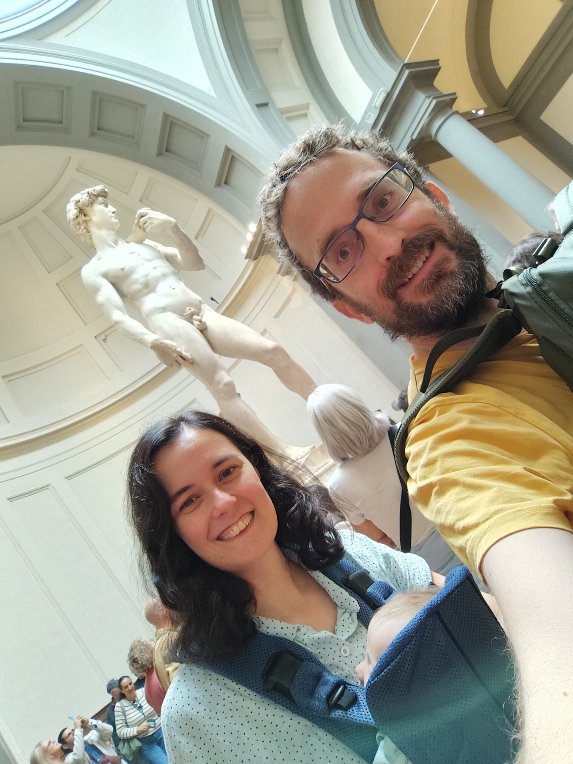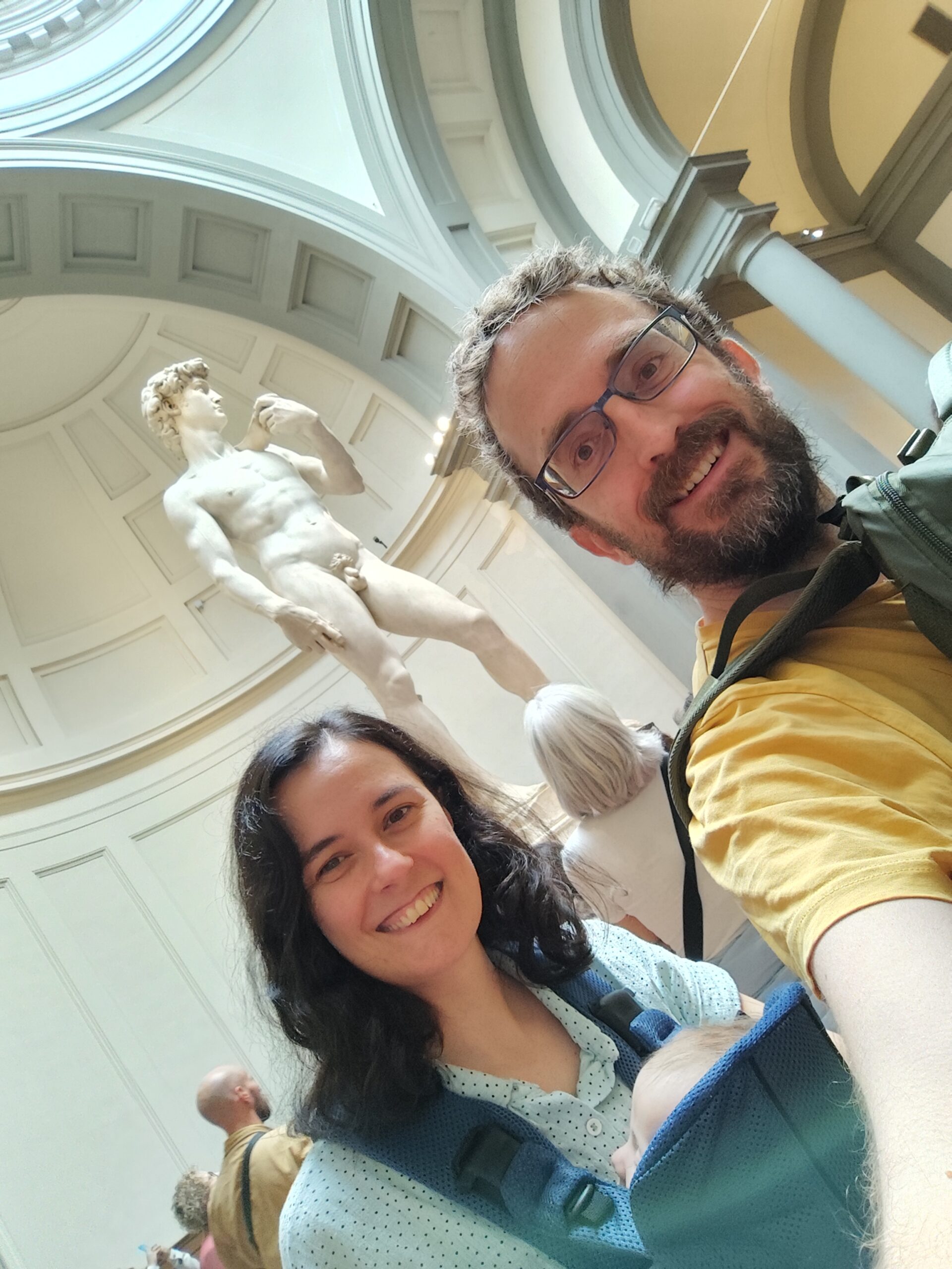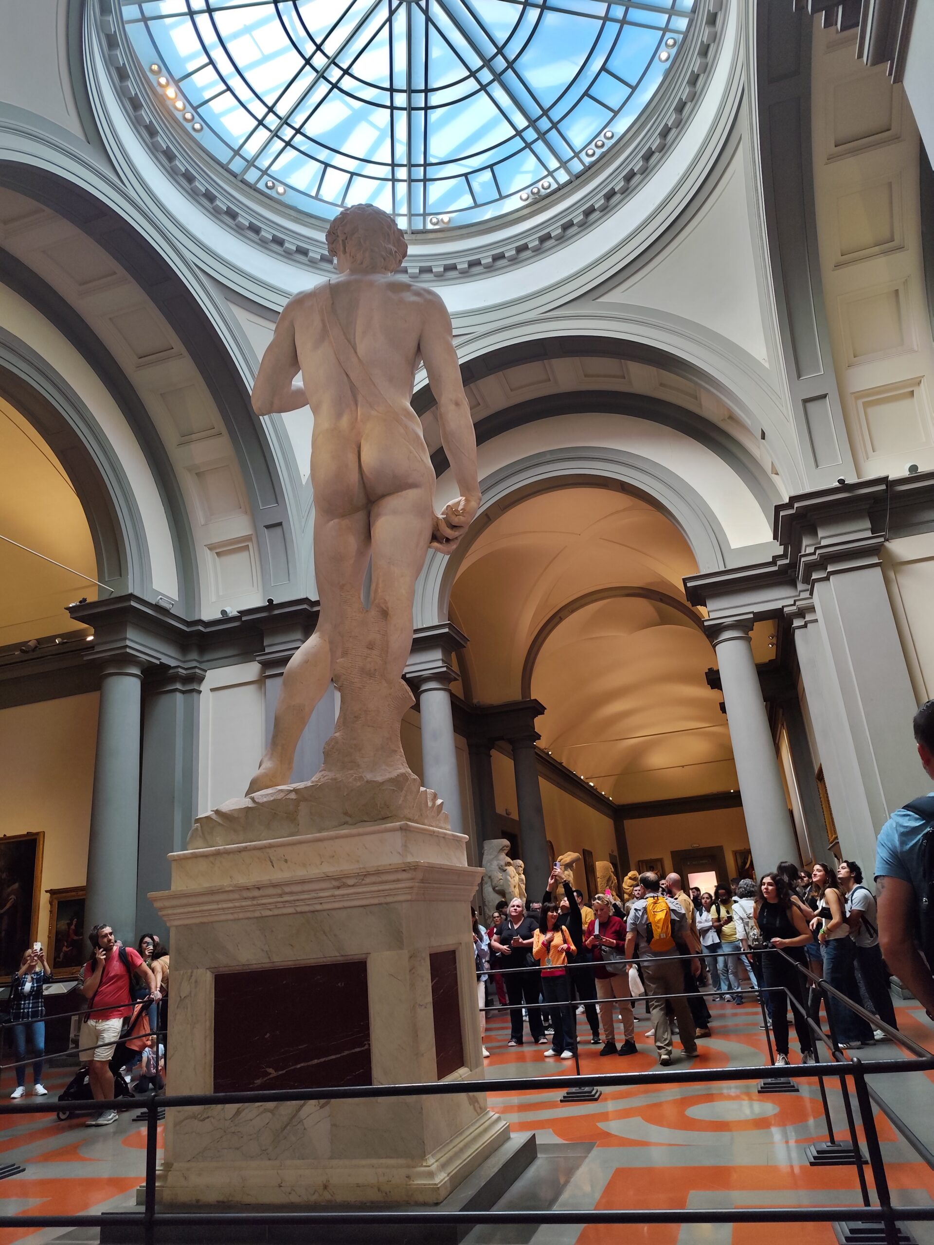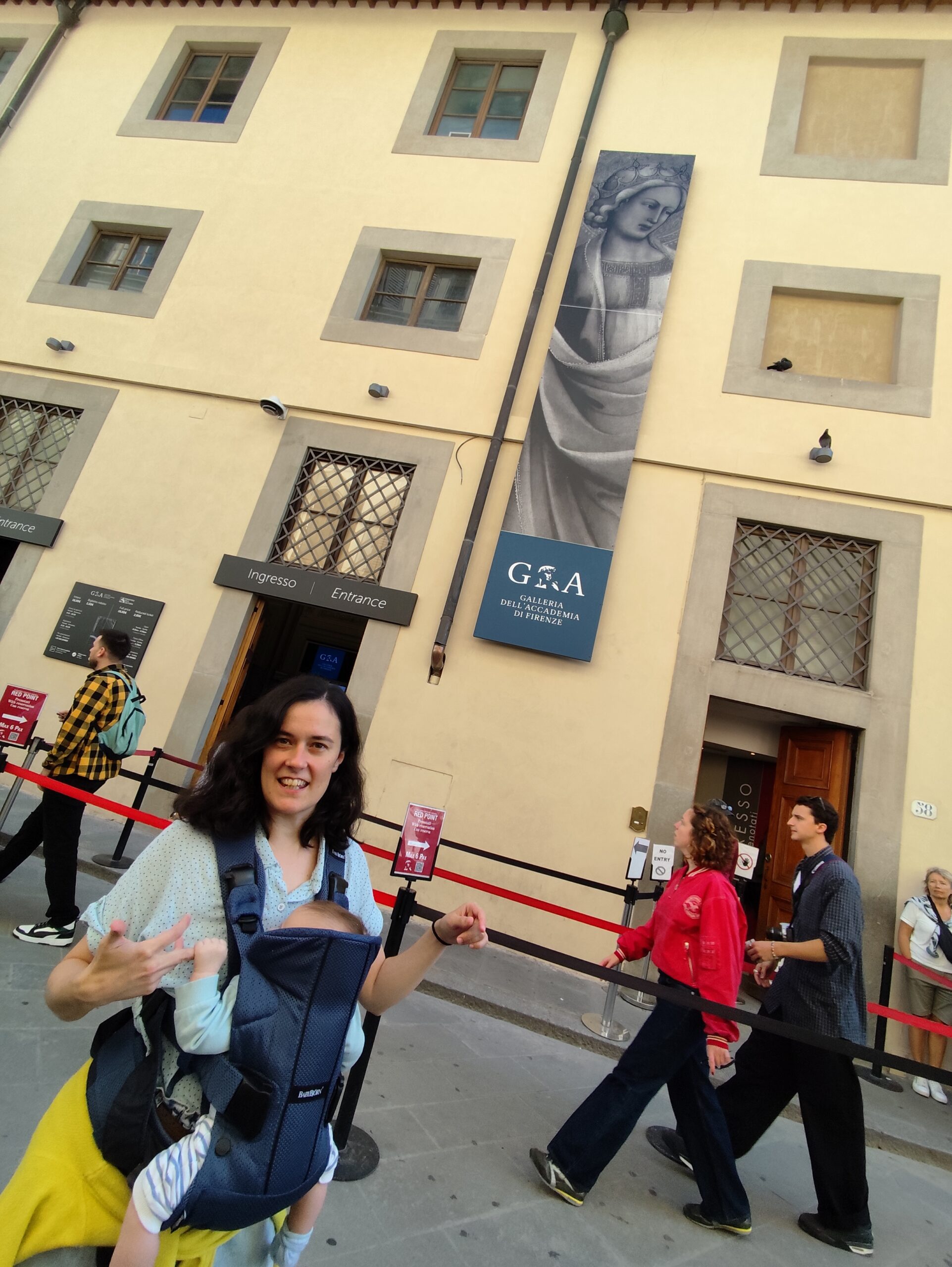 Y fue mejor de lo que esperábamos. Nagore lo resume rápido: «el museo no es muy impresionante, pero el David sí.» Y tiene razón. Llegamos al fondo, cerca del David, pero en vez de quedarnos delante con la marabunta, dimos la vuelta y nos sentamos en el banco de atrás, justo a la altura de su espalda. Esa zona, por alguna razón, estaba prácticamente vacía. Delante se amontona el mundo entero intentando hacerse la foto; detrás, silencio y banco libre. Estuvimos ahí un buen rato, viéndole el culo al David (así, claro), pensando en cómo una sola pieza de mármol puede parar en seco un museo. Mola pensar en el tío que le dio el primer martillazo. Julen, mientras, dormido como un bendito. Fue, de largo, uno de los ratos más guay del viaje.