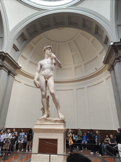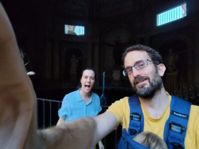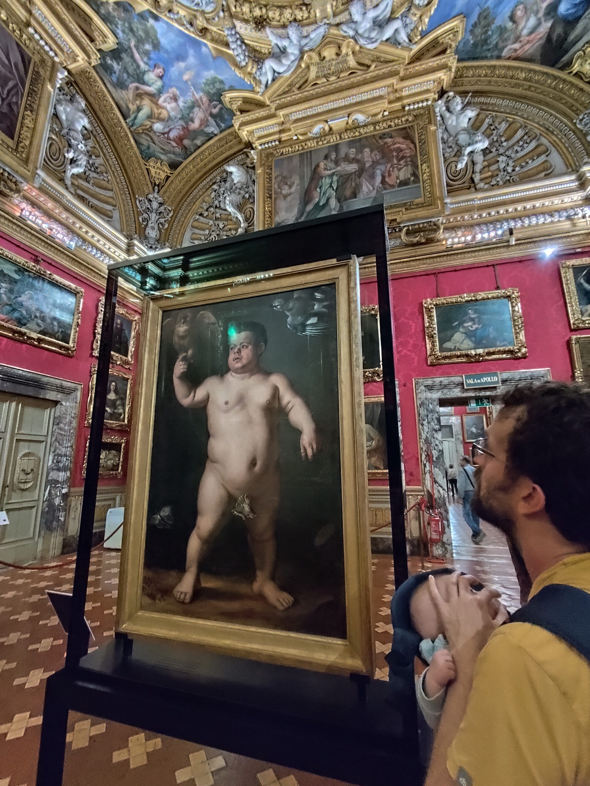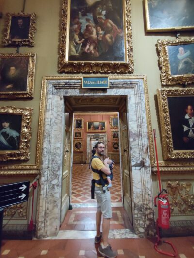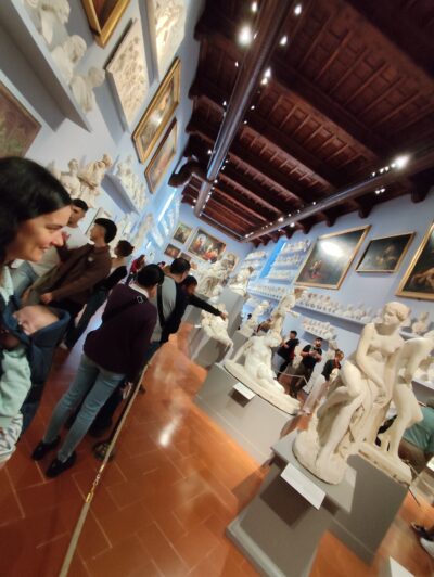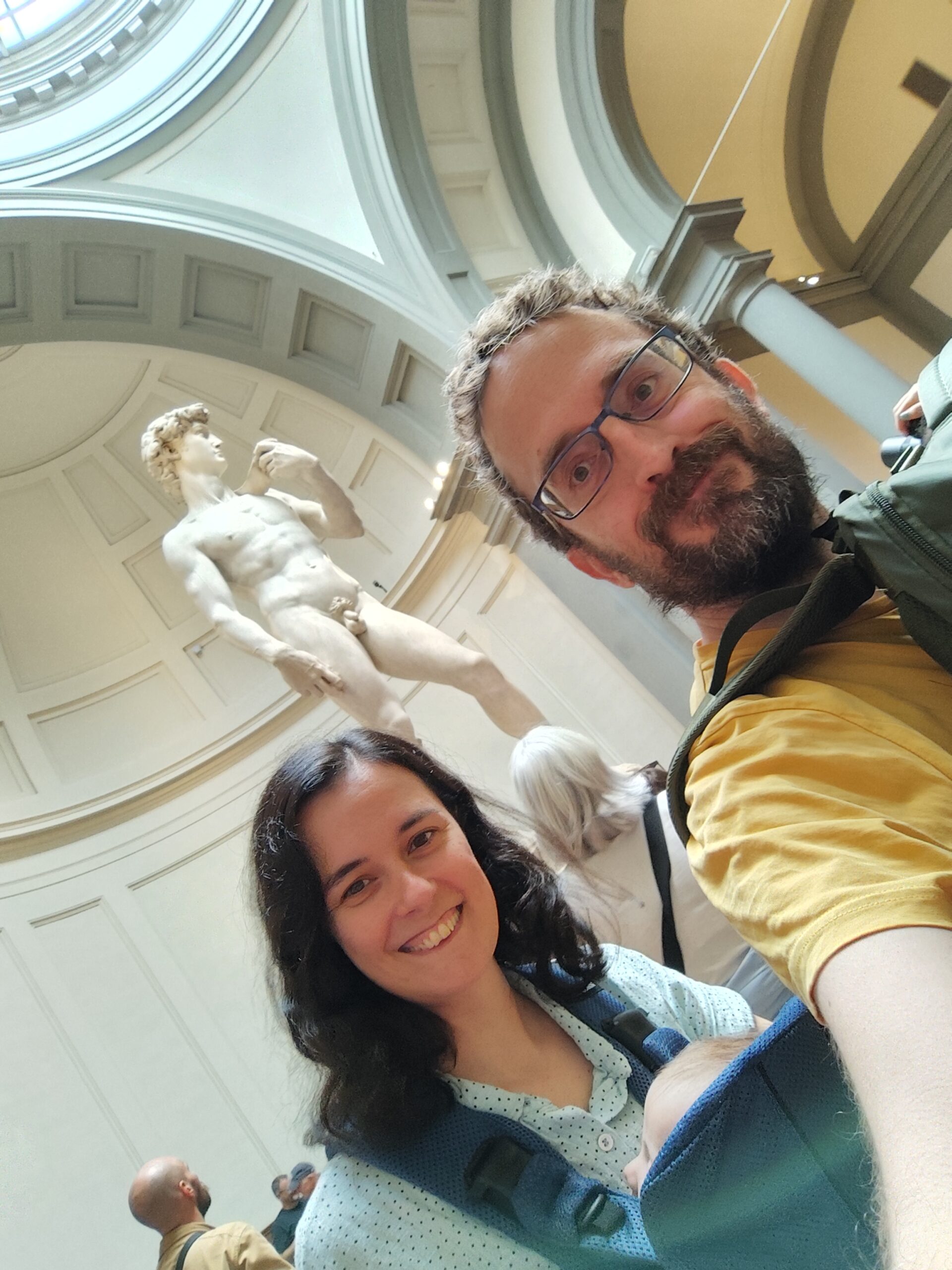 Y fue mejor de lo que esperábamos. Nagore lo resume rápido: «el museo no es muy impresionante, pero el David sí.» Y tiene razón. Llegamos al fondo, cerca del David, pero en vez de quedarnos delante con la marabunta, dimos la vuelta y nos sentamos en el banco de atrás, justo a la altura de su espalda. Esa zona, por alguna razón, estaba prácticamente vacía. Delante se amontona el mundo entero intentando hacerse la foto; detrás, silencio y banco libre. Estuvimos ahí un buen rato, viéndole el culo al David (así, claro), pensando en cómo una sola pieza de mármol puede parar en seco un museo. Mola pensar en el tío que le dio el primer martillazo. Julen, mientras, dormido como un bendito. Fue, de largo, uno de los ratos más guay del viaje.
