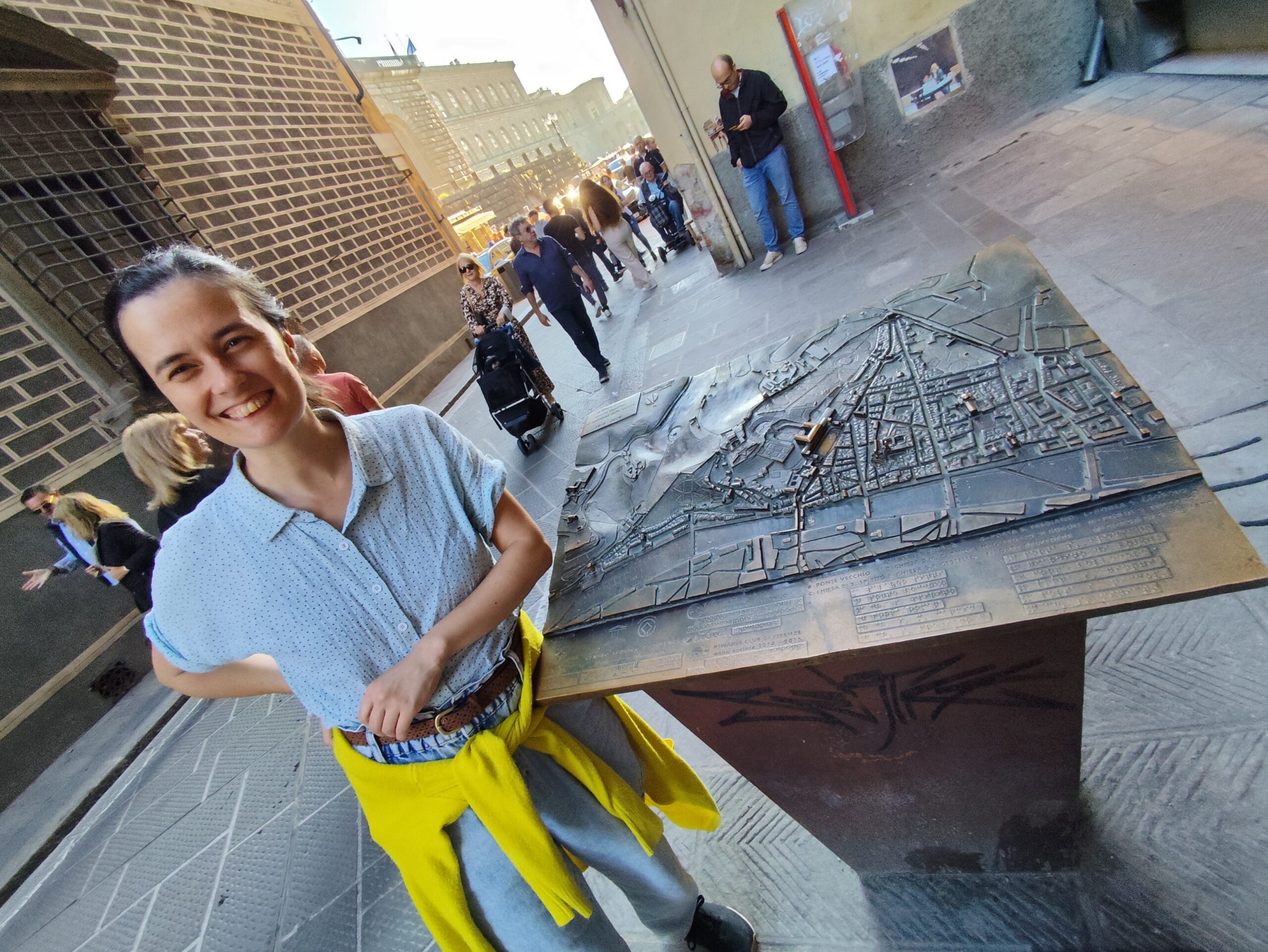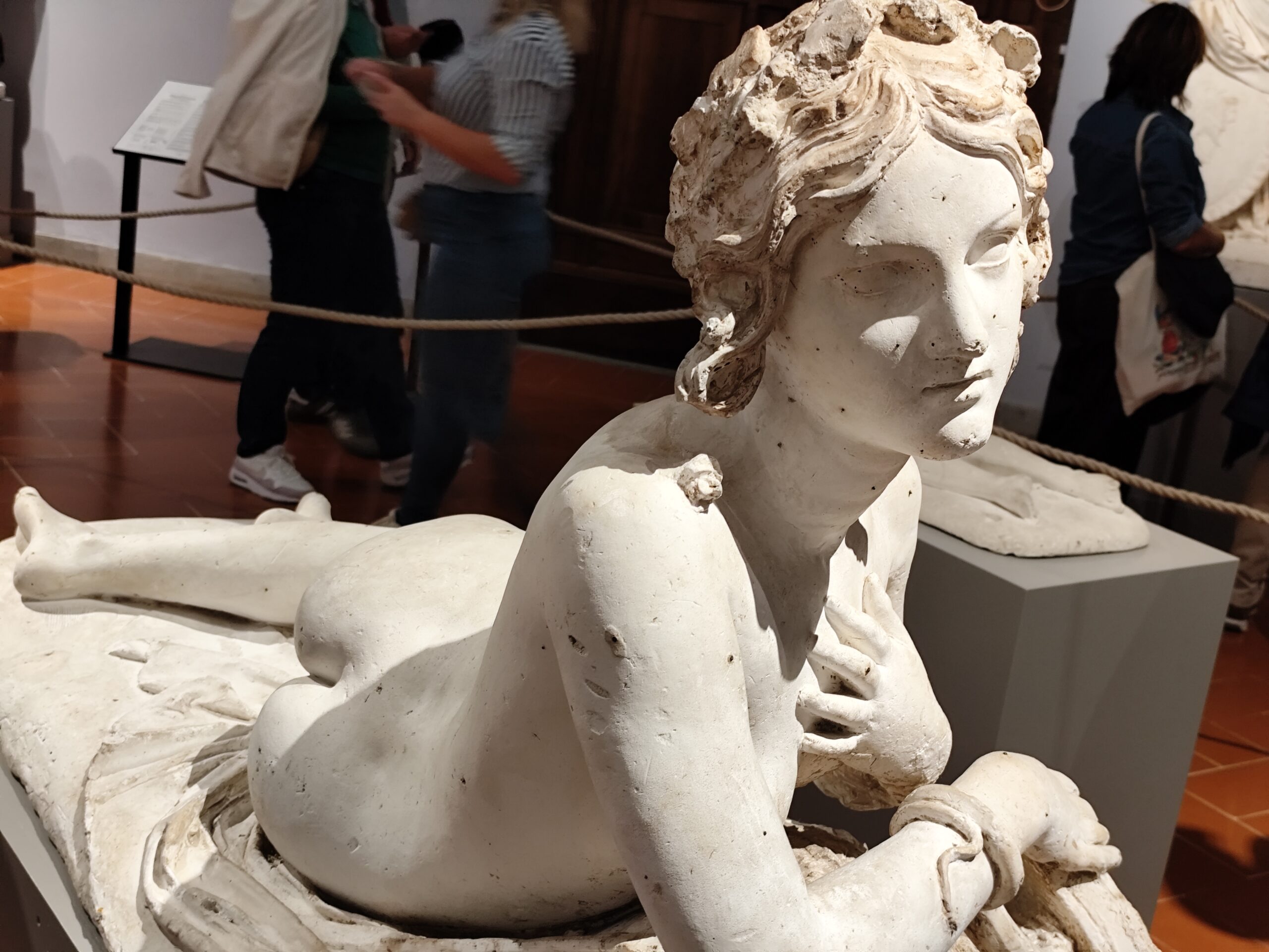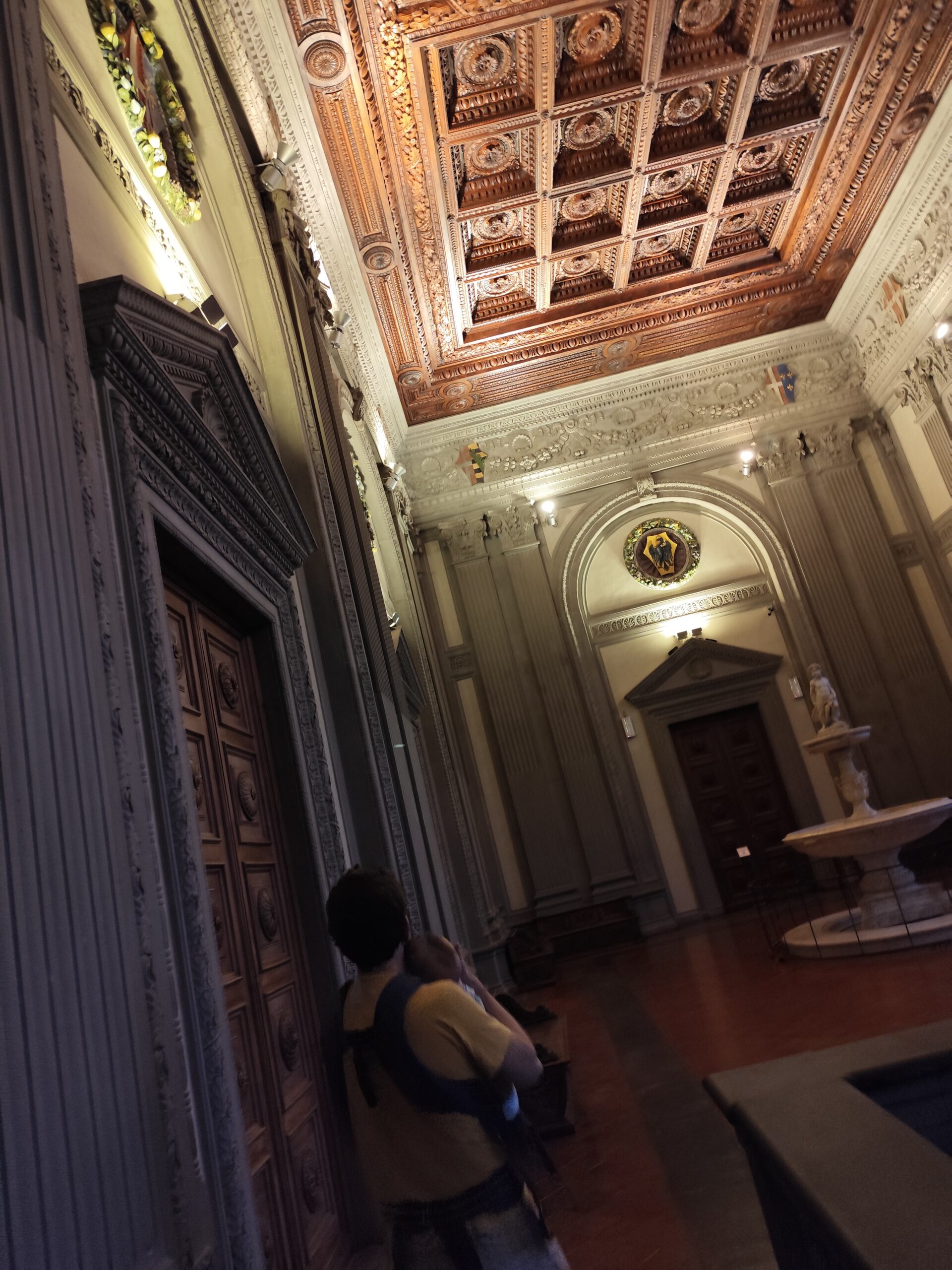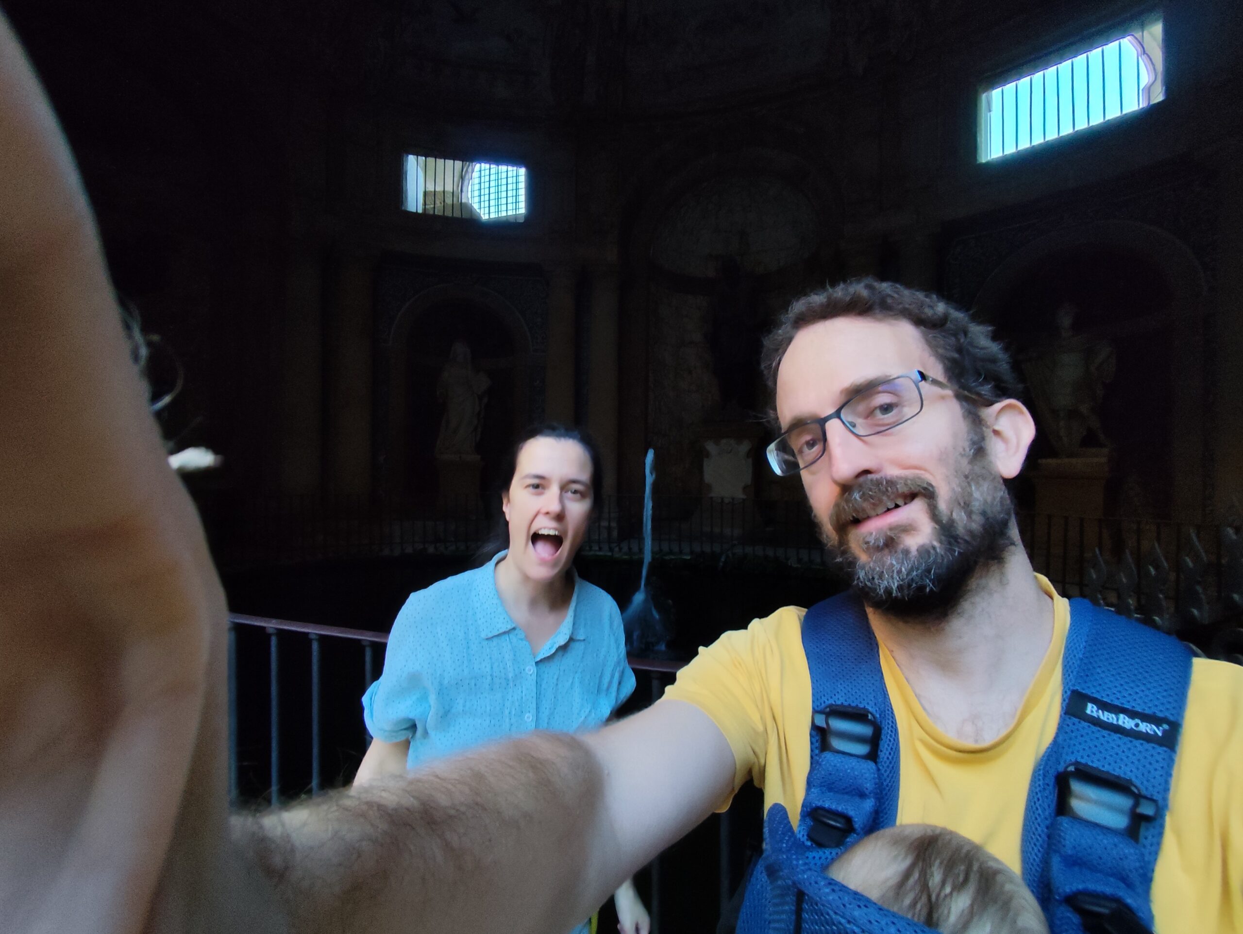 Y fue mejor de lo que esperábamos. Nagore lo resume rápido: «el museo no es muy impresionante, pero el David sí.» Y tiene razón. Llegamos al fondo, cerca del David, pero en vez de quedarnos delante con la marabunta, dimos la vuelta y nos sentamos en el banco de atrás, justo a la altura de su espalda. Esa zona, por alguna razón, estaba prácticamente vacía. Delante se amontona el mundo entero intentando hacerse la foto; detrás, silencio y banco libre. Estuvimos ahí un buen rato, viéndole el culo al David (así, claro), pensando en cómo una sola pieza de mármol puede parar en seco un museo. Mola pensar en el tío que le dio el primer martillazo. Julen, mientras, dormido como un bendito. Fue, de largo, uno de los ratos más guay del viaje.