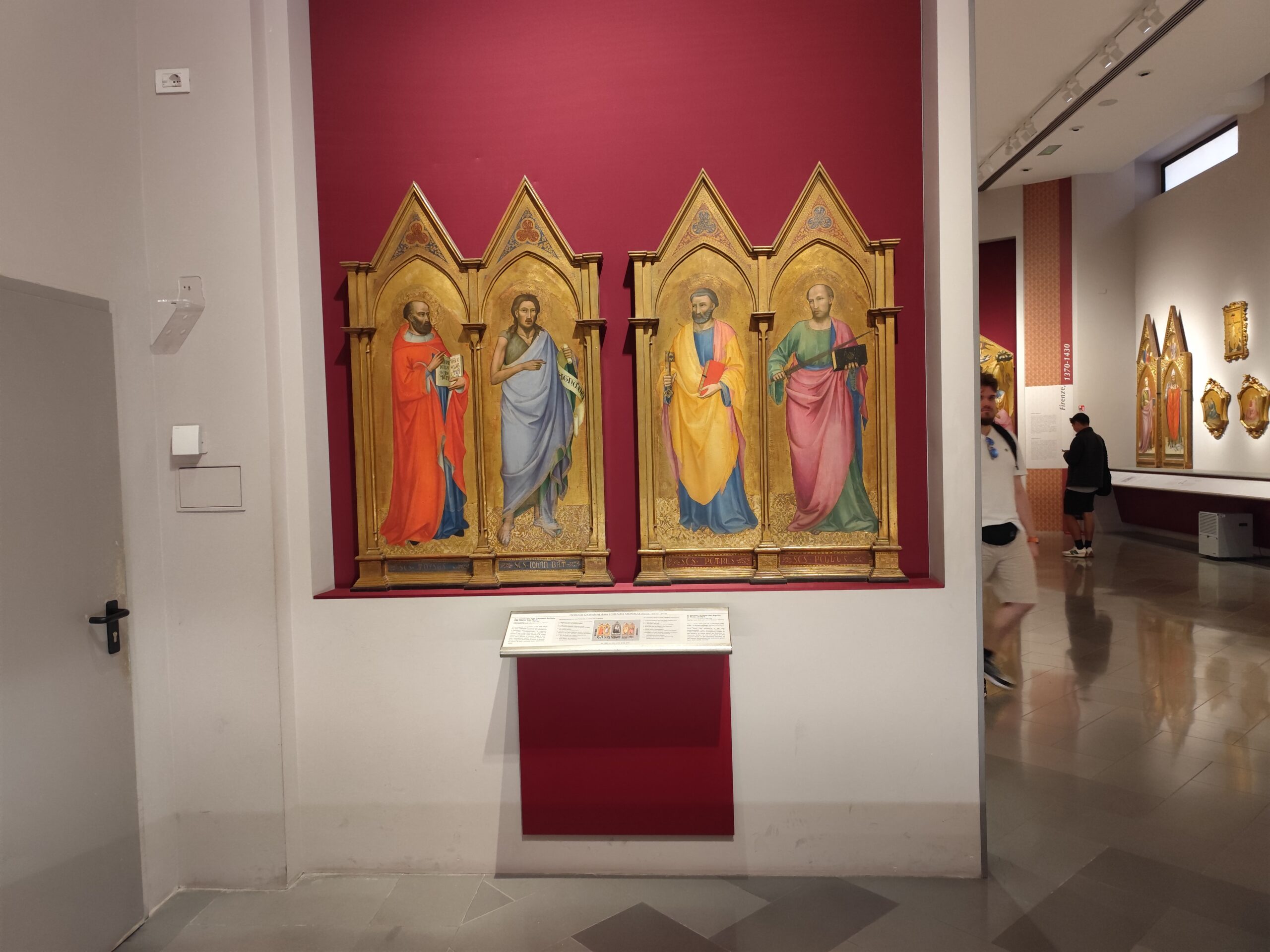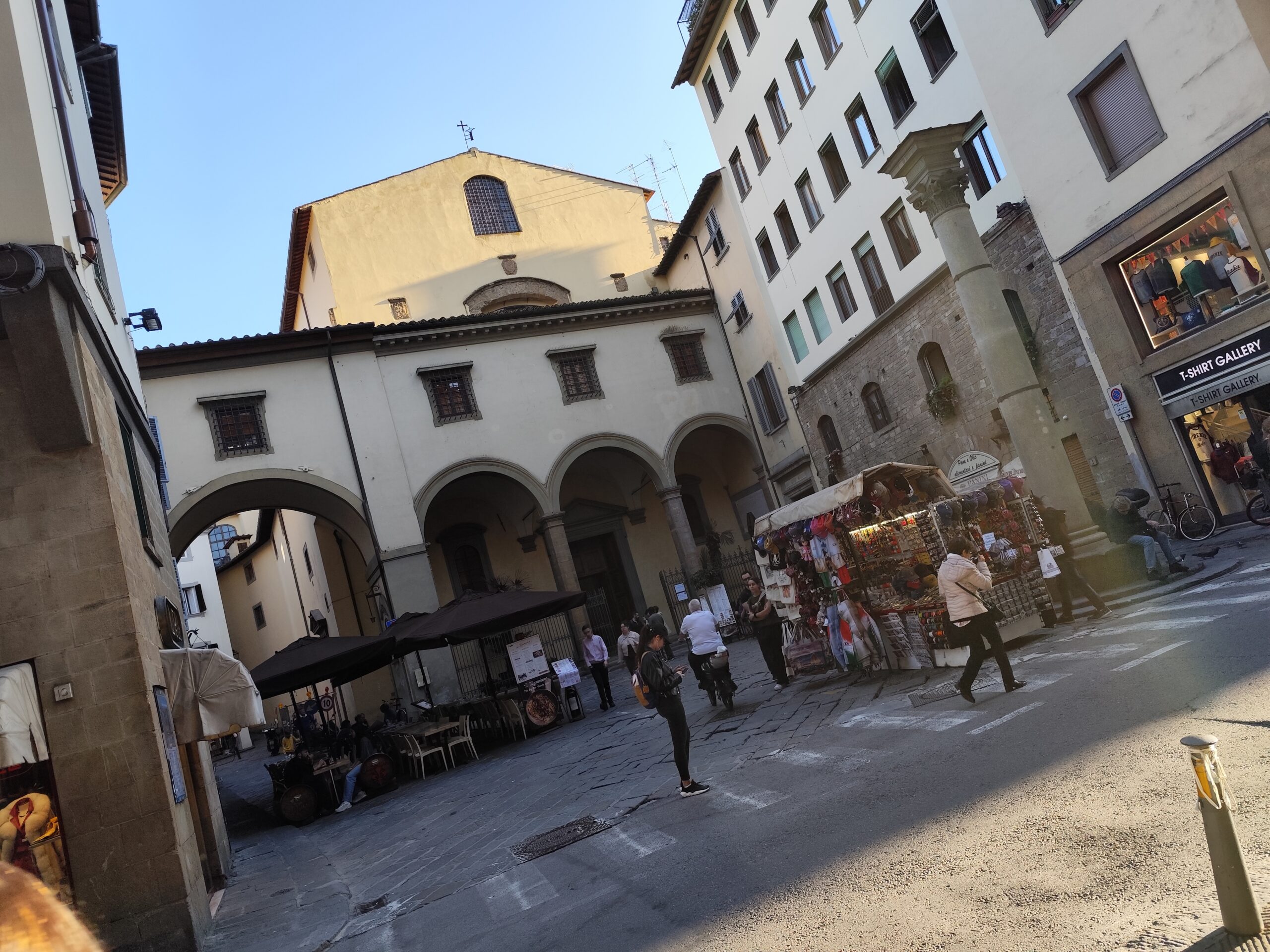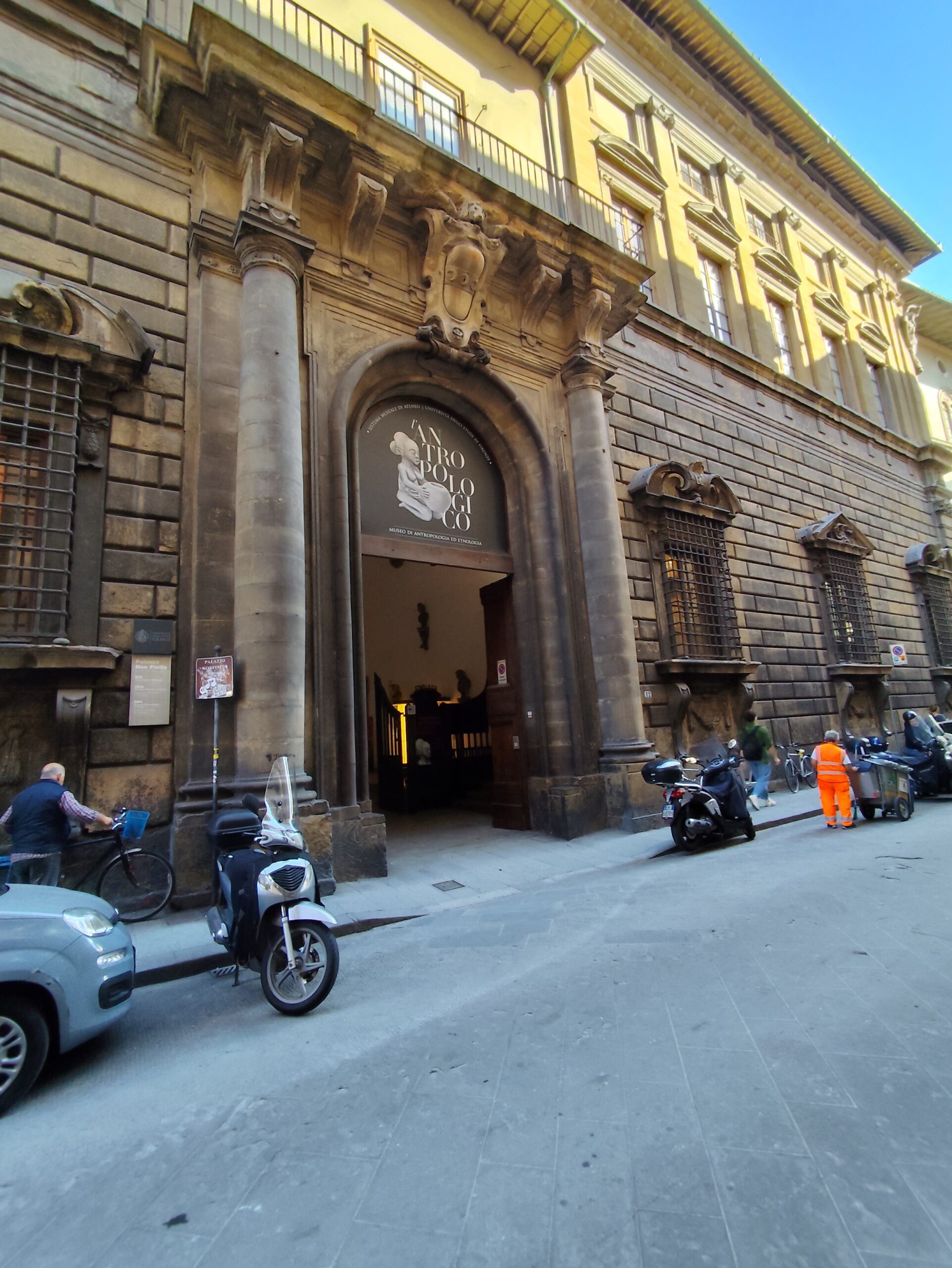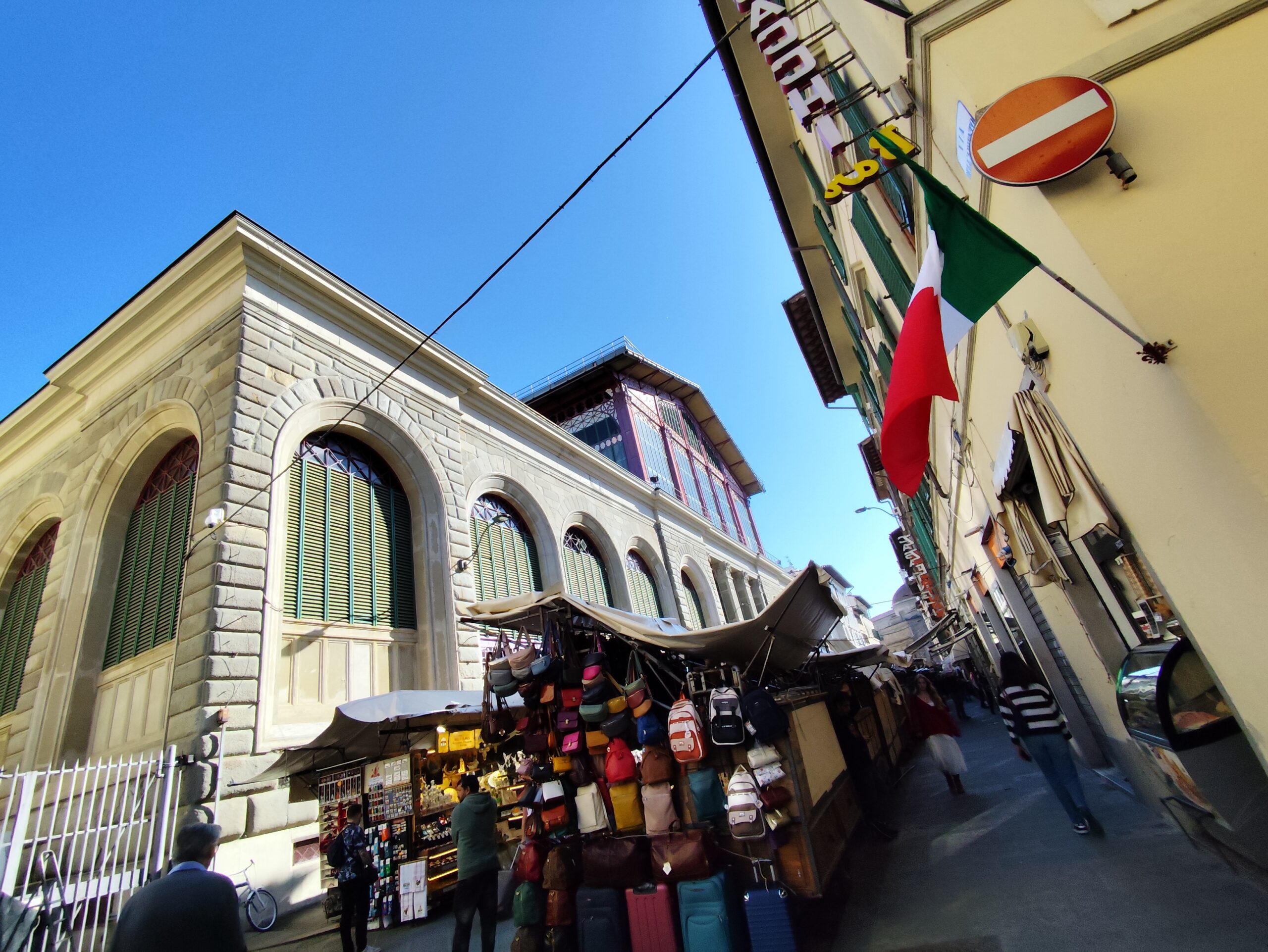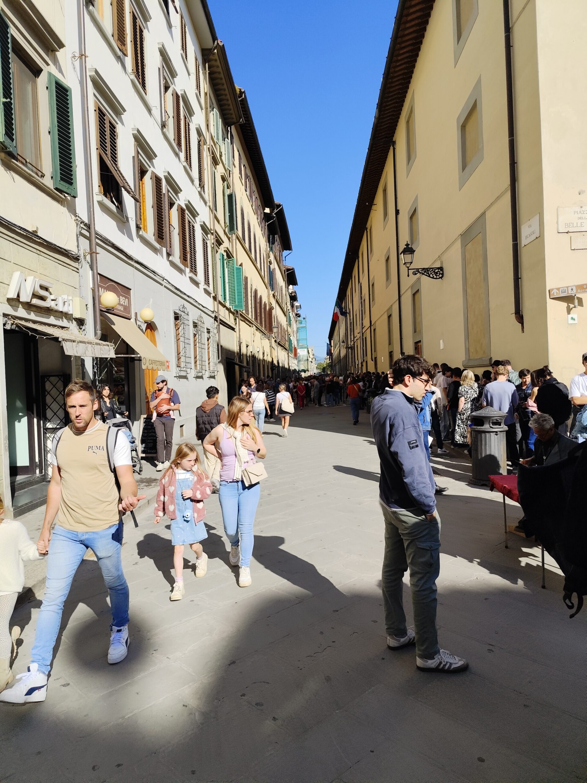 Salimos de la estación — que ya conocemos bien — y enfilamos hacia el Mercado Central. Por la mañana, el cuadrante exterior se llena de un mercadillo animado, con puestos de imanes, bolsos, cinturones y souvenirs de todo pelaje. No compramos nada; seguimos camino. Desde ahí, directos a la Galleria dell’Accademia, que nos recibe en plena obra: buena parte del edificio está cubierto por un andamiaje con lona. Con la Firenze Card pasamos por taquilla para canjearla por la entrada con hora concreta — una de esas cosas que no te cuentan en ningún folleto pero que conviene saber — y ya dentro no le echamos muchas cuentas al resto de salas. Íbamos a una cosa.