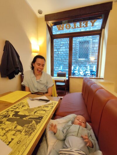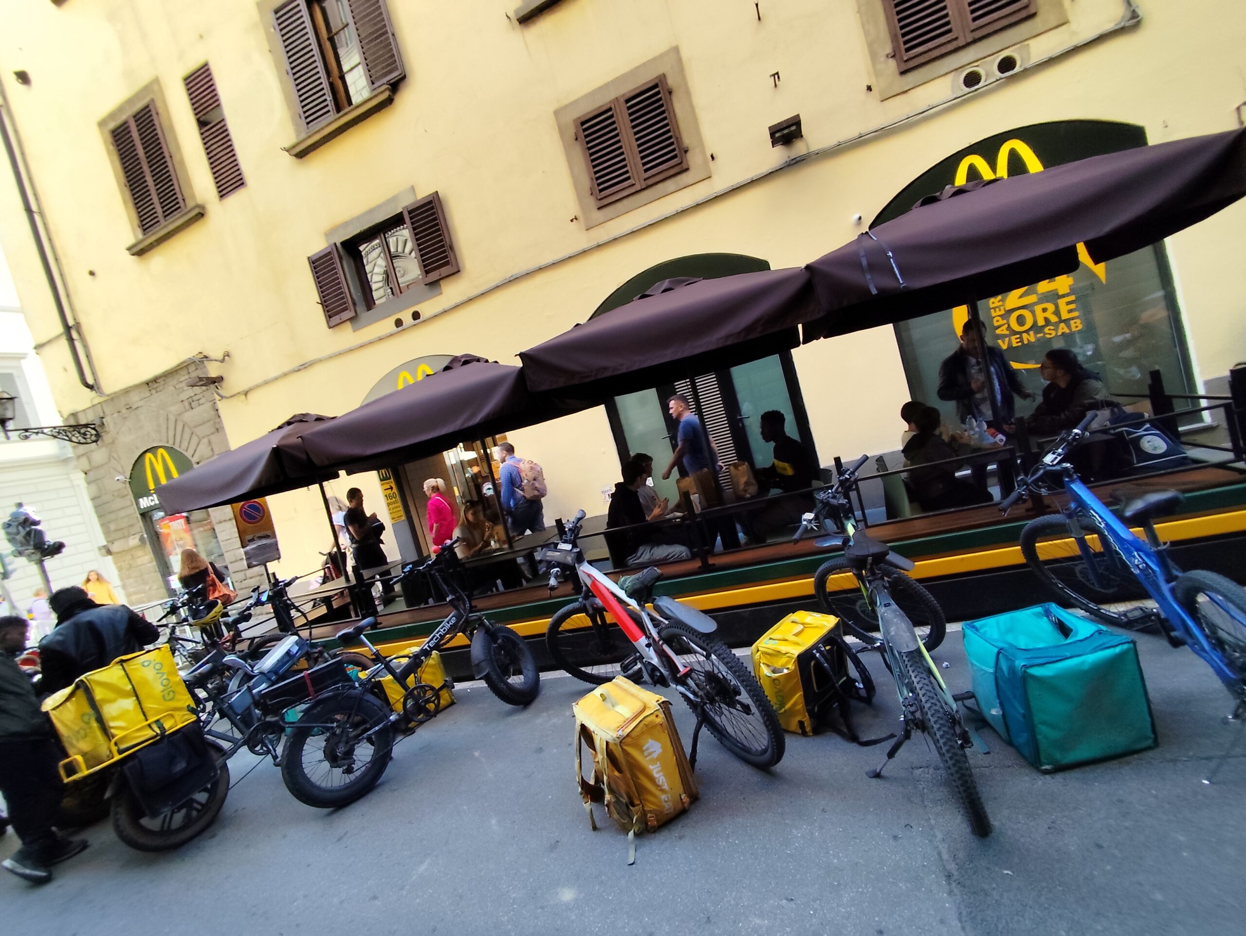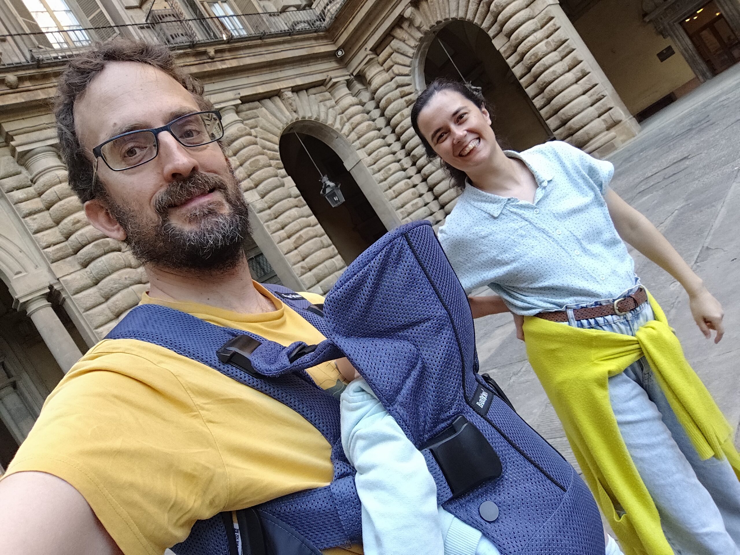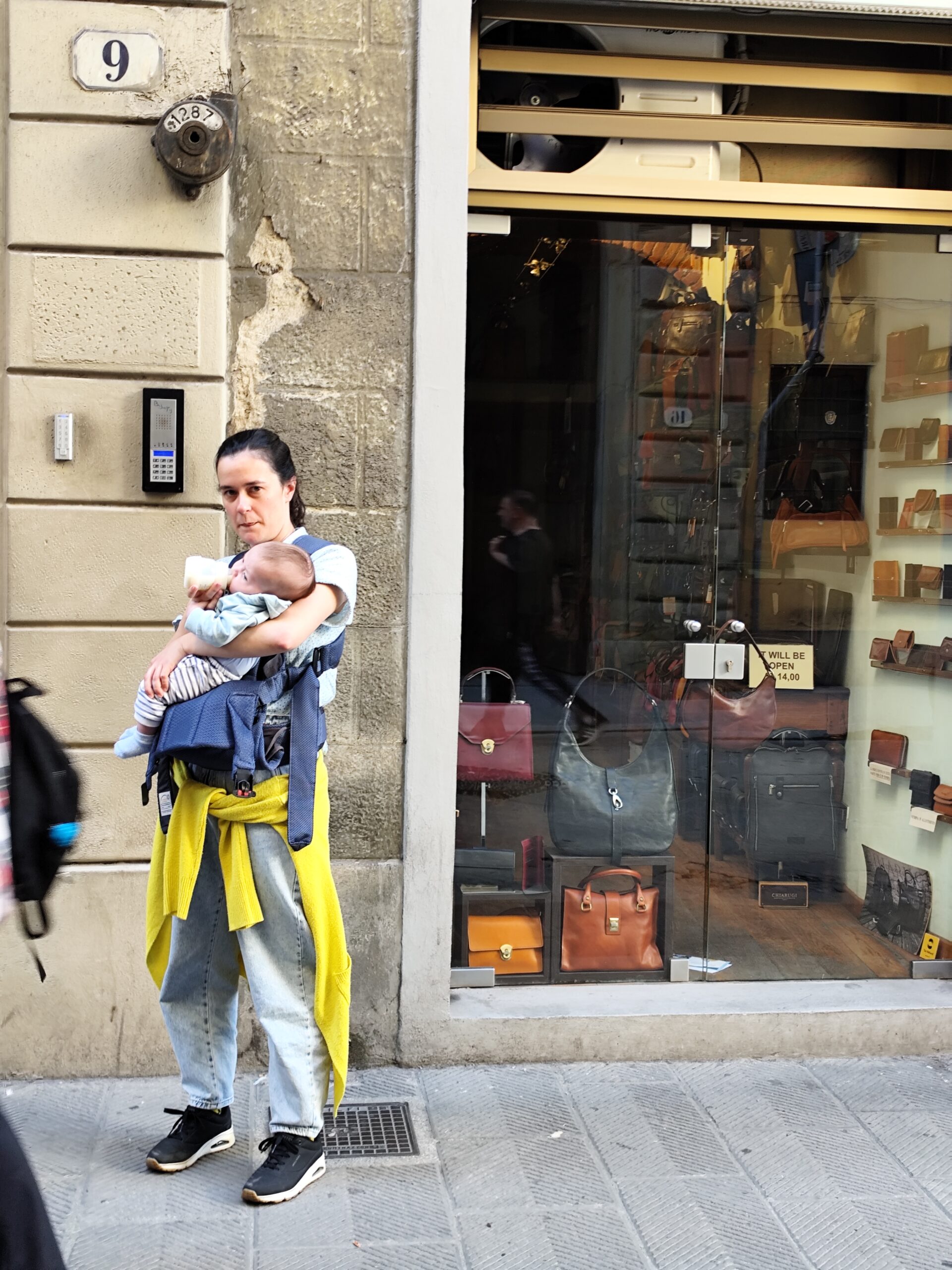 Salimos de la Accademia y volvimos sobre nuestros pasos hacia la piazza del duomo. El estómago empezaba a avisar. Le dimos un biberón a Julen y nos pusimos a buscar sitio. La pregunta de estos días, invariable: «¿tenéis un banco o un sofá donde podamos tumbar al peque?». Hasta que dimos con uno que se llama Yellow, donde nos contestaron sin pestañear: «claro que sí». Nos sentaron en un sofá pegado a la cocina, con Julen tumbado a nuestro lado, y comimos sorprendentemente bien para un sitio elegido por logística. (Aquí añado, para quien nos lee con cariño, que Julen aprovechó el rato tranquilo para hacerse caca de las grandes — un clásico.)