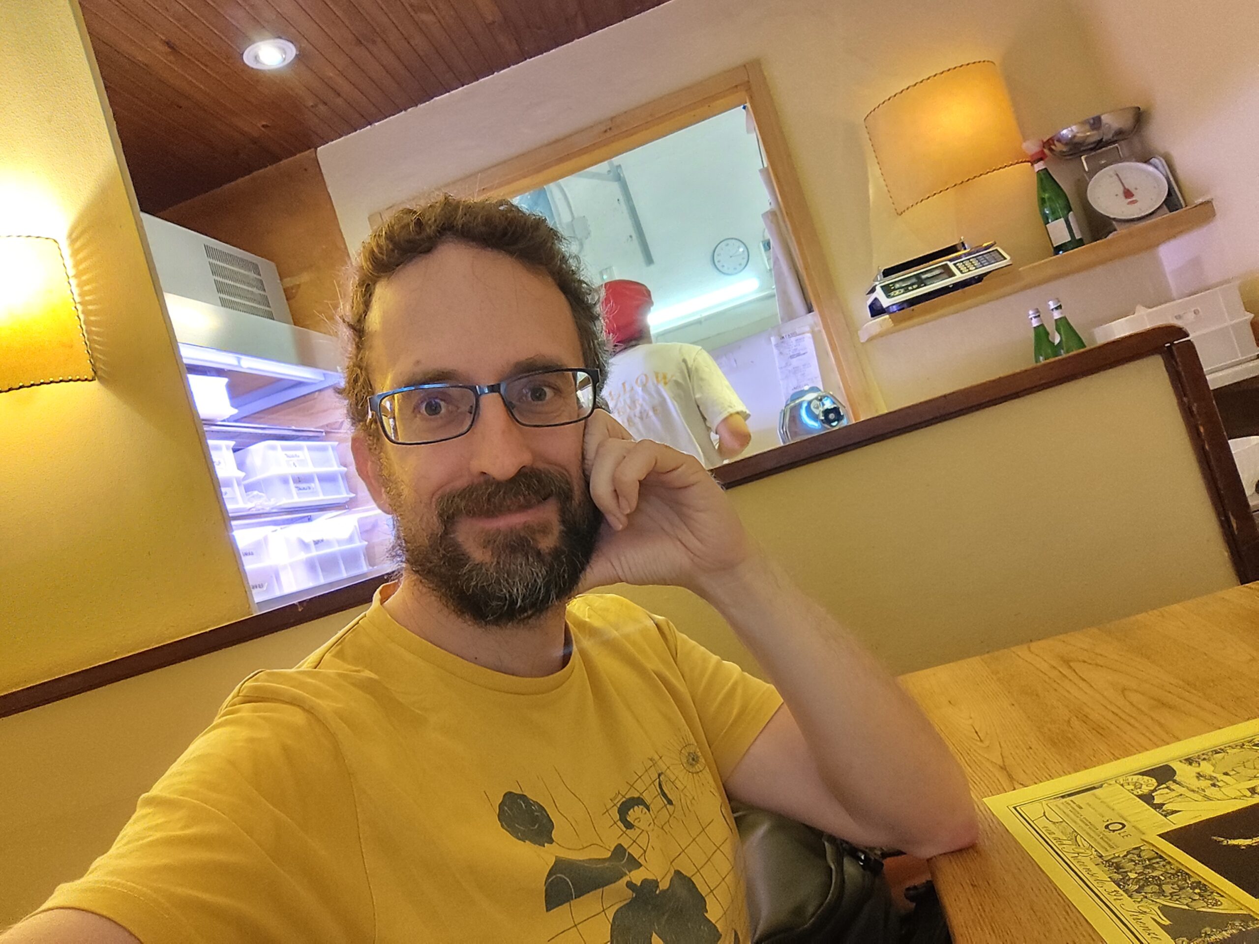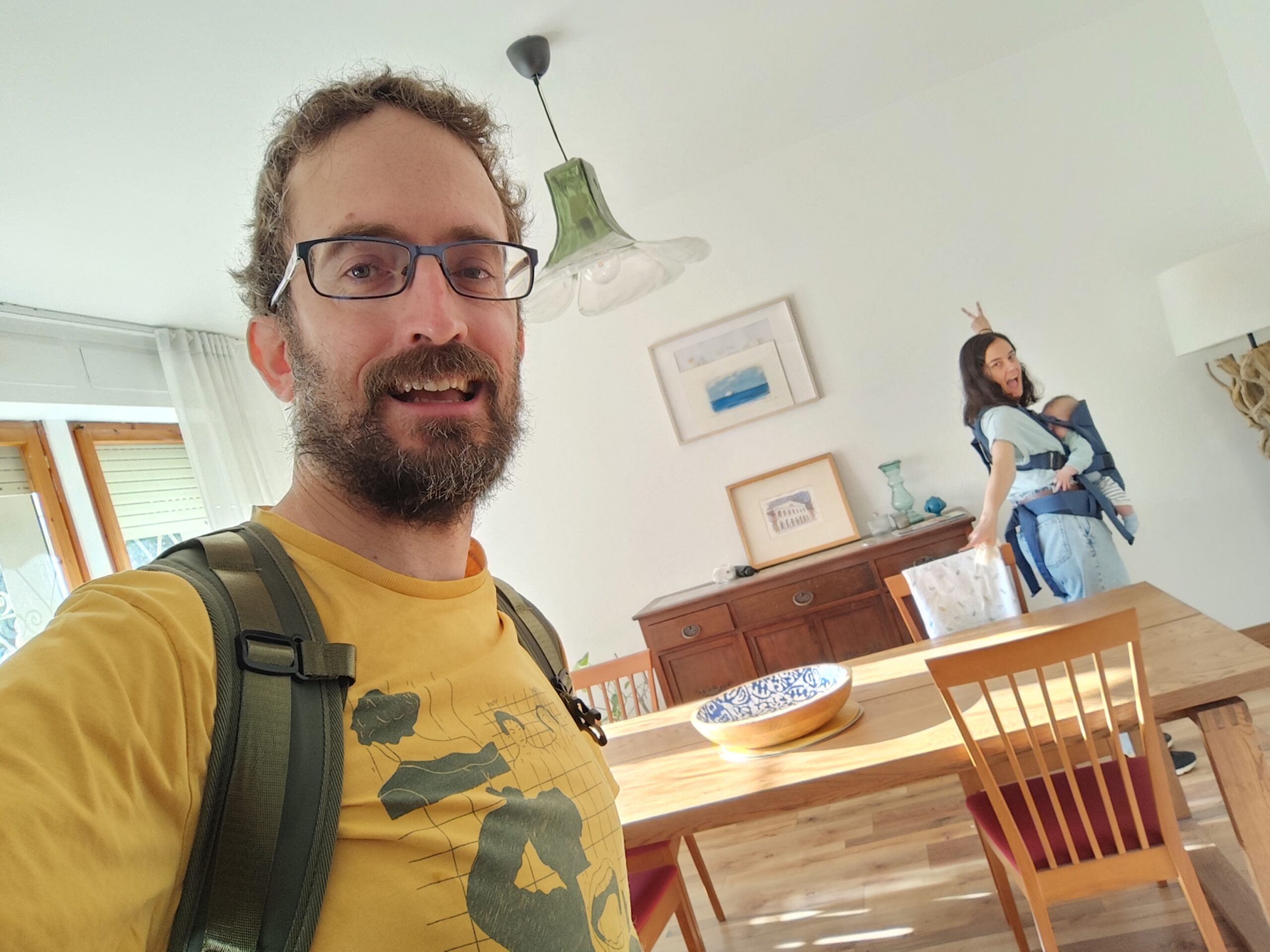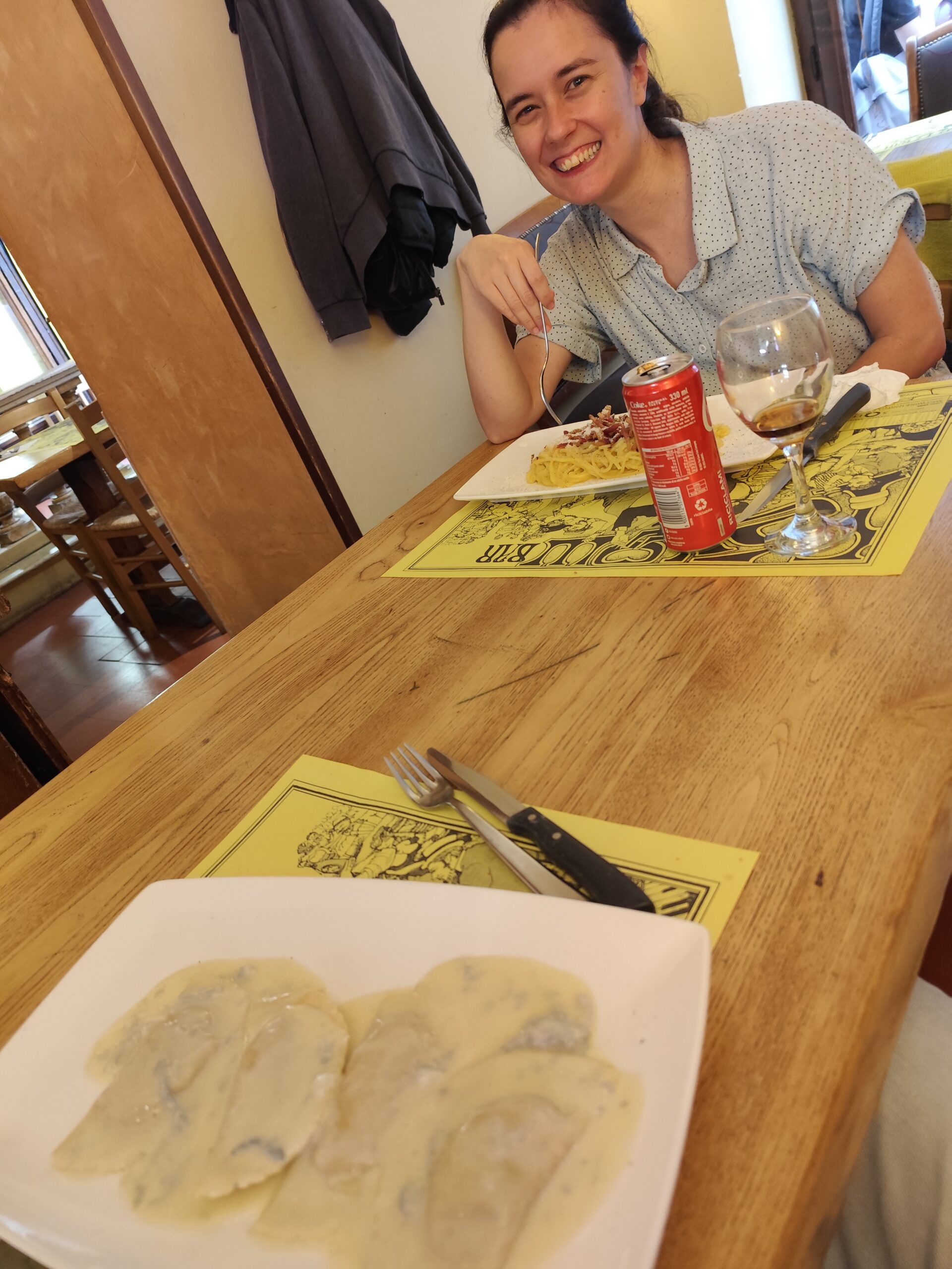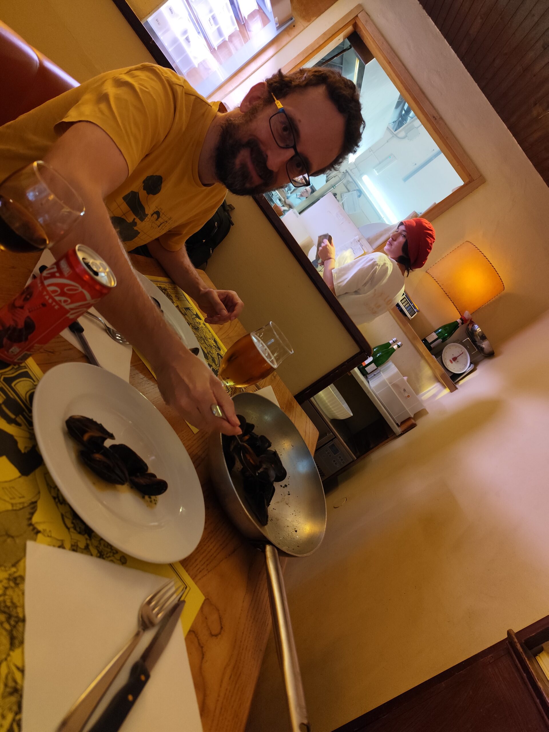 Salimos de la Accademia y volvimos sobre nuestros pasos hacia la piazza del duomo. El estómago empezaba a avisar. Le dimos un biberón a Julen y nos pusimos a buscar sitio. La pregunta de estos días, invariable: «¿tenéis un banco o un sofá donde podamos tumbar al peque?». Hasta que dimos con uno que se llama Yellow, donde nos contestaron sin pestañear: «claro que sí». Nos sentaron en un sofá pegado a la cocina, con Julen tumbado a nuestro lado, y comimos sorprendentemente bien para un sitio elegido por logística. (Aquí añado, para quien nos lee con cariño, que Julen aprovechó el rato tranquilo para hacerse caca de las grandes — un clásico.)