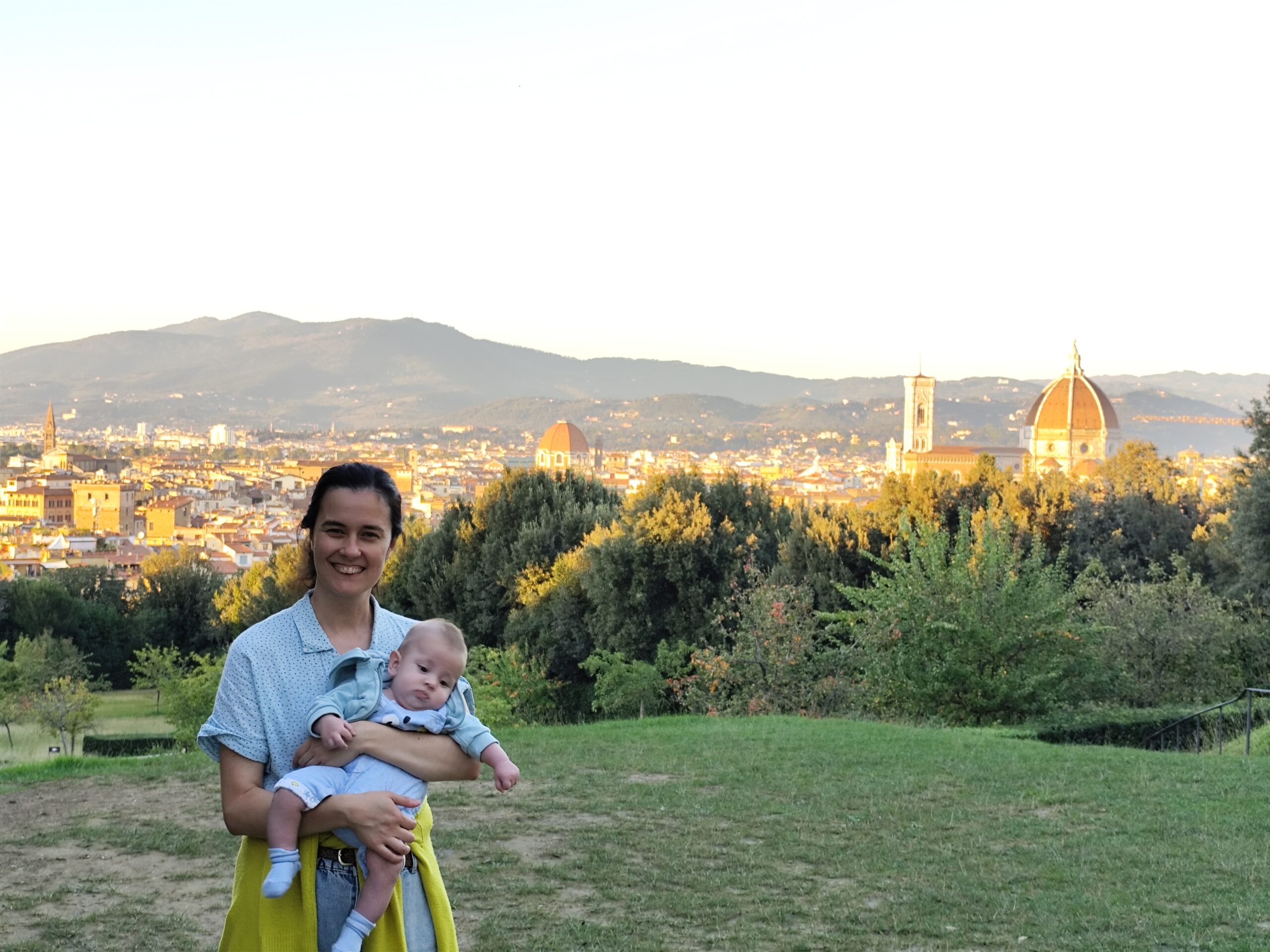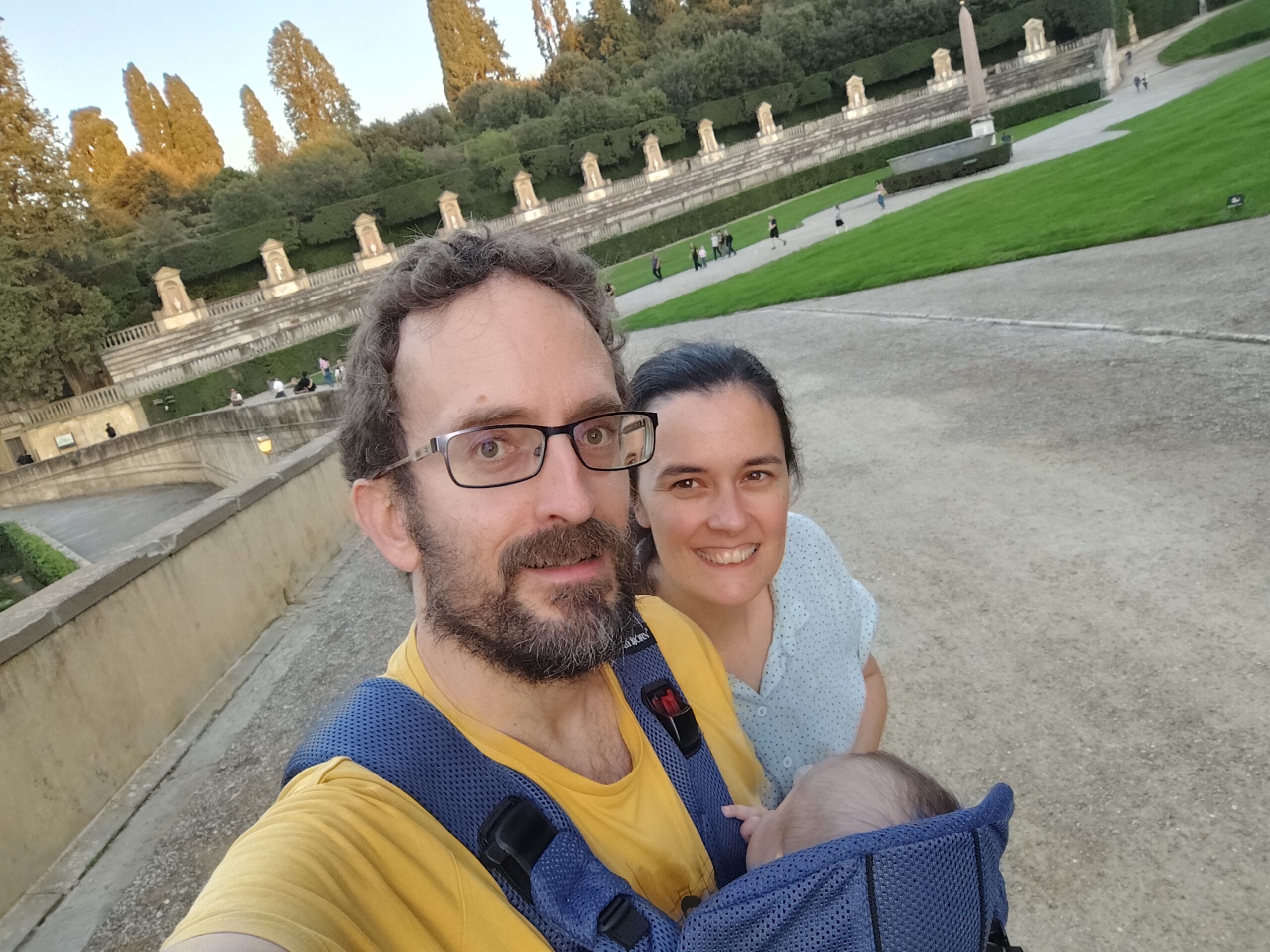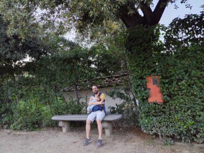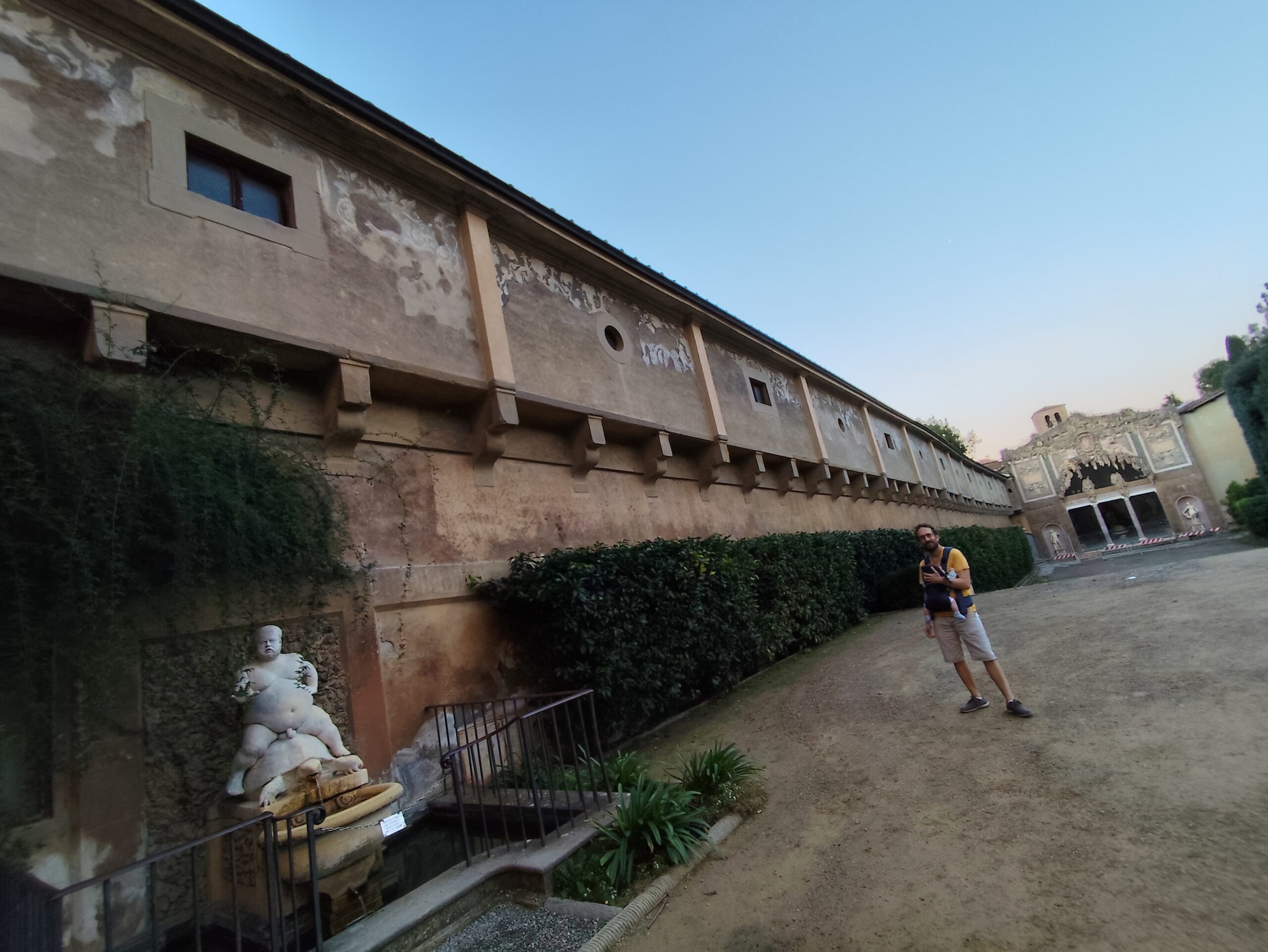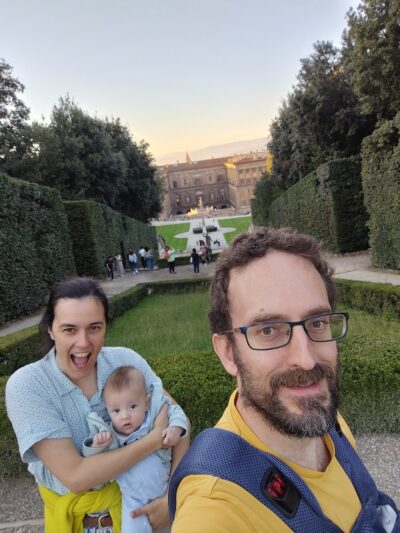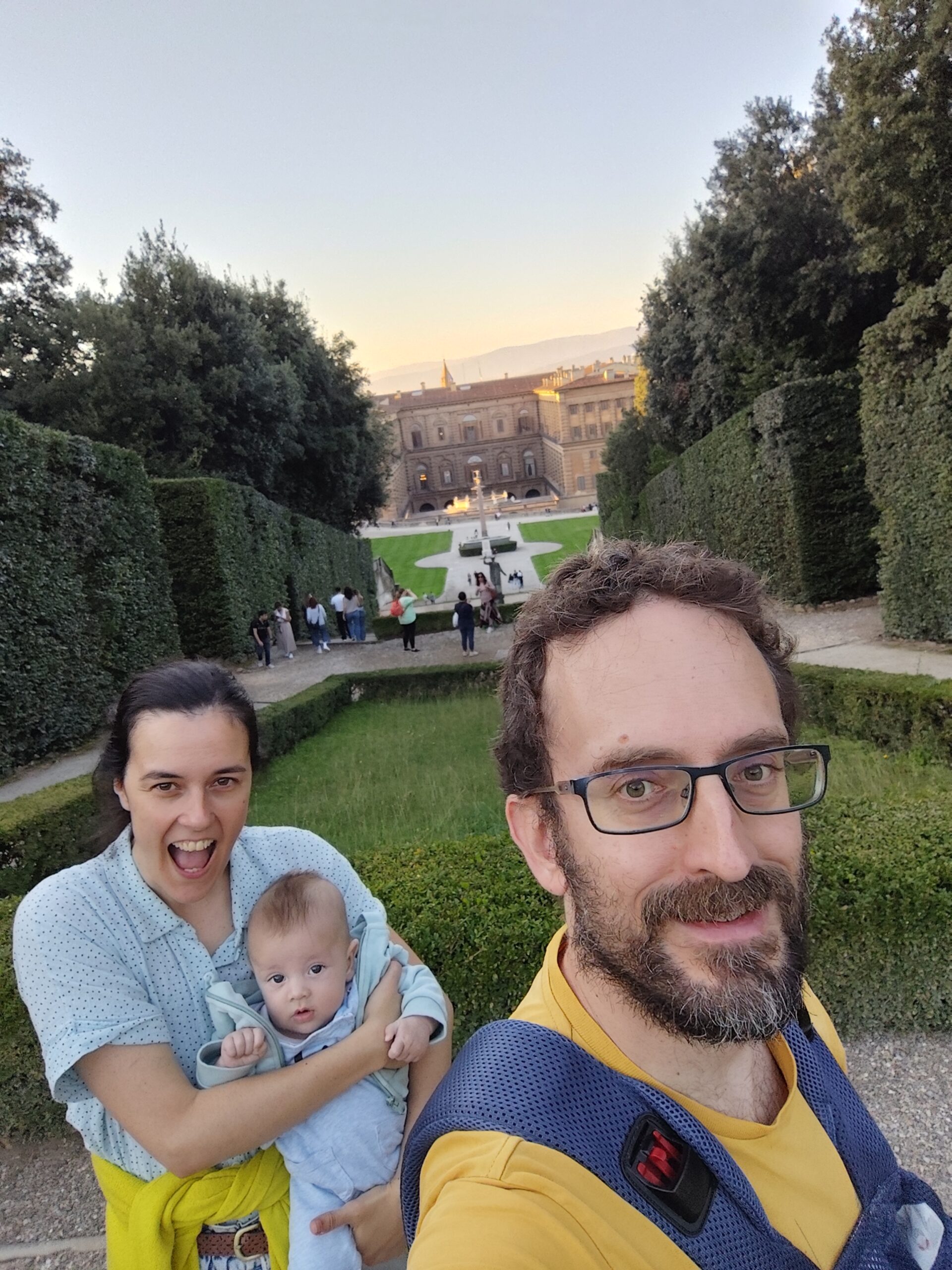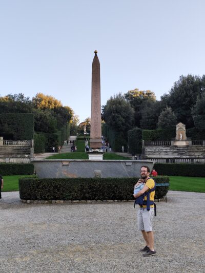 Pero lo mejor del Pitti no está dentro: están los jardines de Boboli. Habíamos estado al inicio. Y subir. Y subir. No exagero: un montón de escaleras. En un par de descansillos nos sentamos un rato largo para recuperar el aliento con el peque en brazos. Pero ahí arriba, con Florencia entera abajo y la cúpula de Brunelleschi asomando como un sello en el centro, la subida cobró sentido. Ya empezaba a caer el sol y todo tenía ese tono naranja que Toscana regala sin pedirlo. Estuvimos haciendo fotos un buen rato; me acuerdo del silencio, del cansancio bueno y de pensar que este parque, solo, ya justificaba el día.