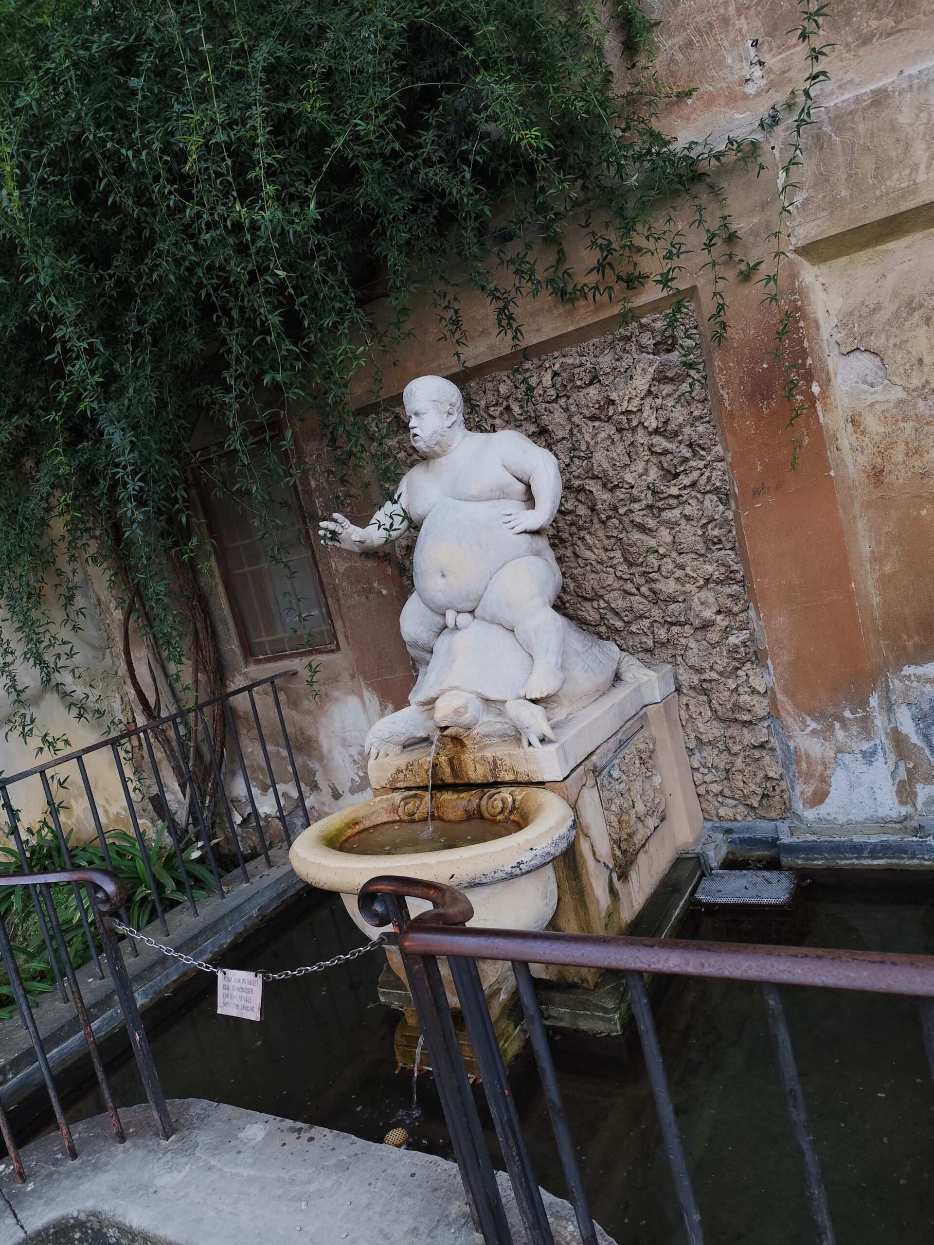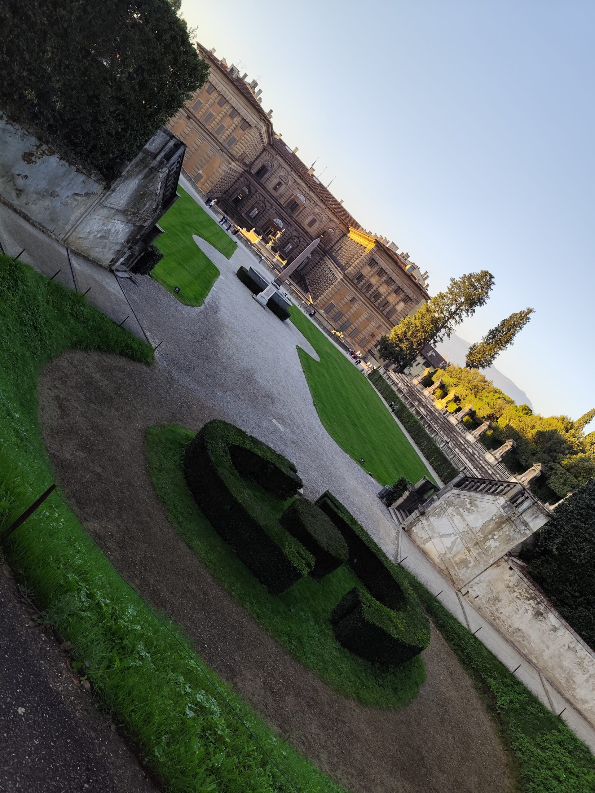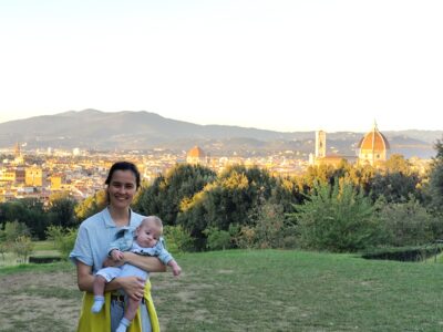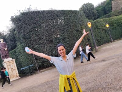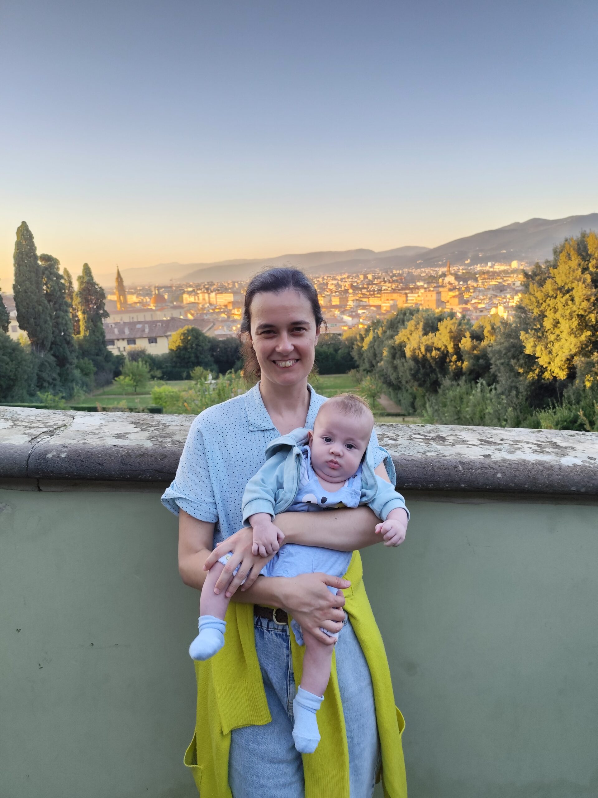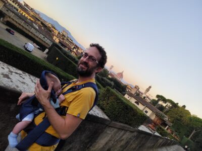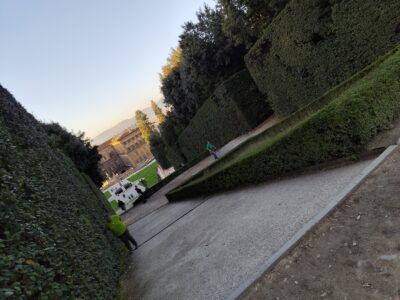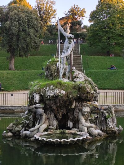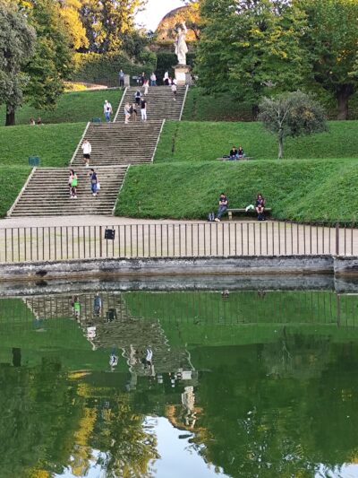 Pero lo mejor del Pitti no está dentro: están los jardines de Boboli. Habíamos estado al inicio. Y subir. Y subir. No exagero: un montón de escaleras. En un par de descansillos nos sentamos un rato largo para recuperar el aliento con el peque en brazos. Pero ahí arriba, con Florencia entera abajo y la cúpula de Brunelleschi asomando como un sello en el centro, la subida cobró sentido. Ya empezaba a caer el sol y todo tenía ese tono naranja que Toscana regala sin pedirlo. Estuvimos haciendo fotos un buen rato; me acuerdo del silencio, del cansancio bueno y de pensar que este parque, solo, ya justificaba el día.