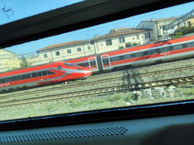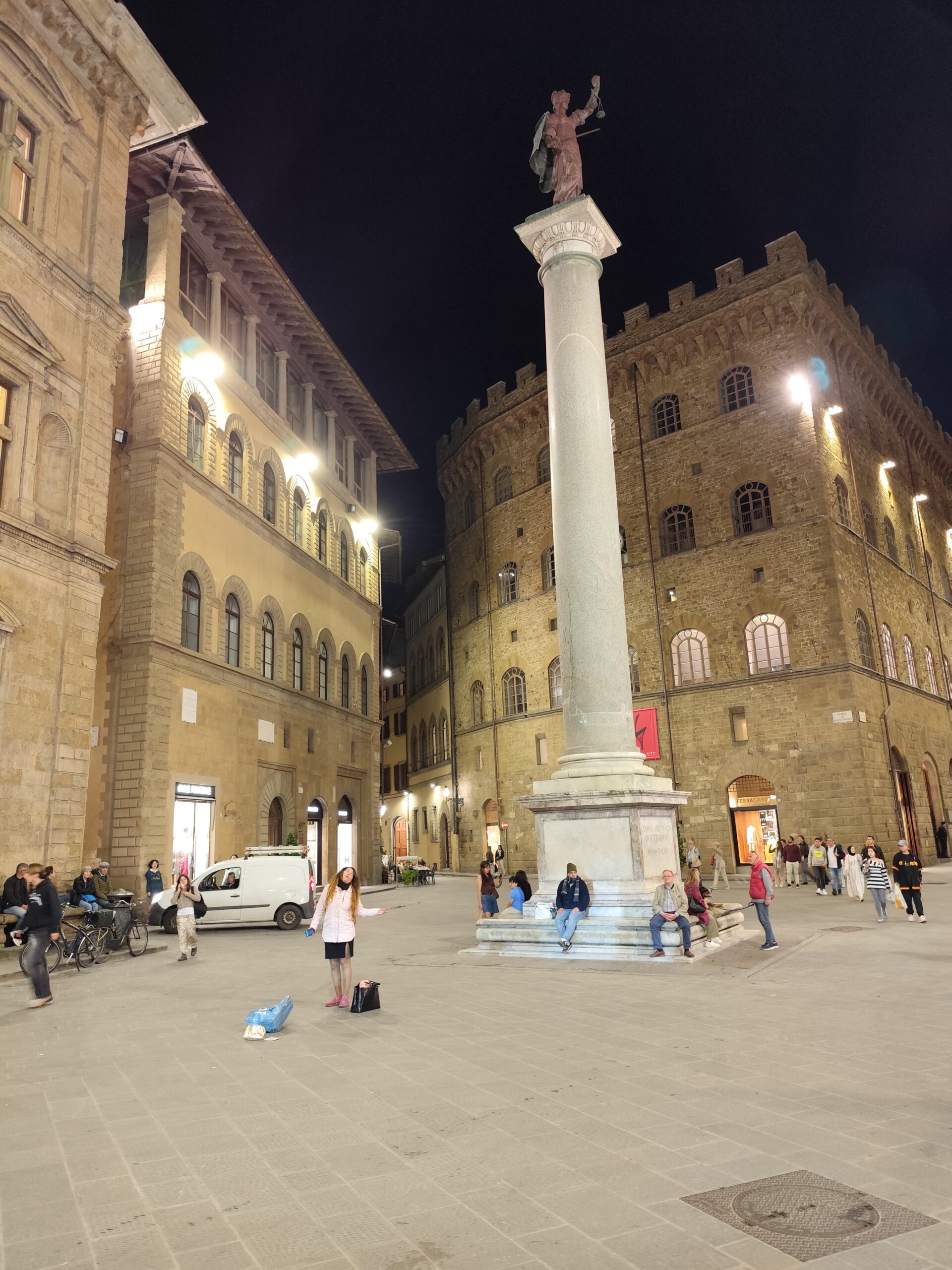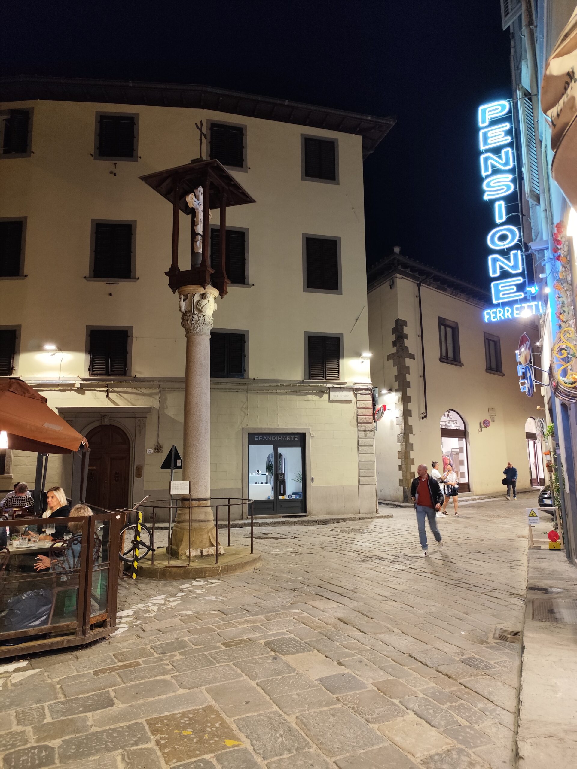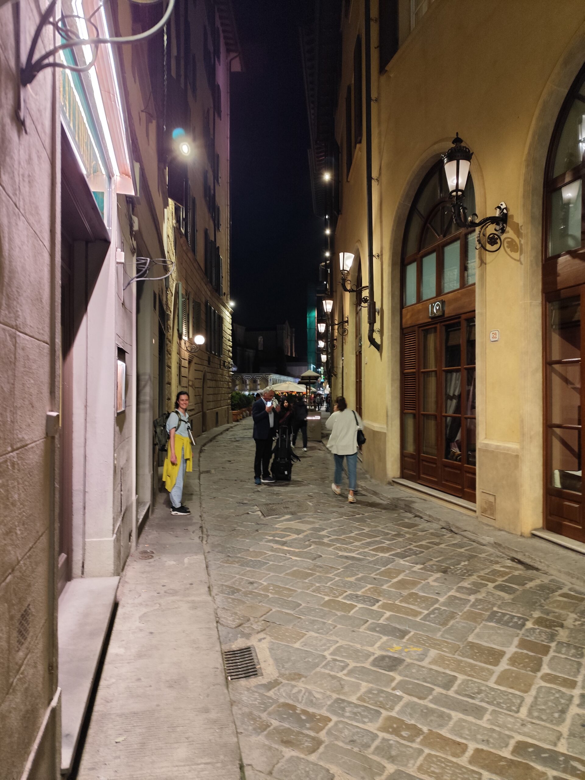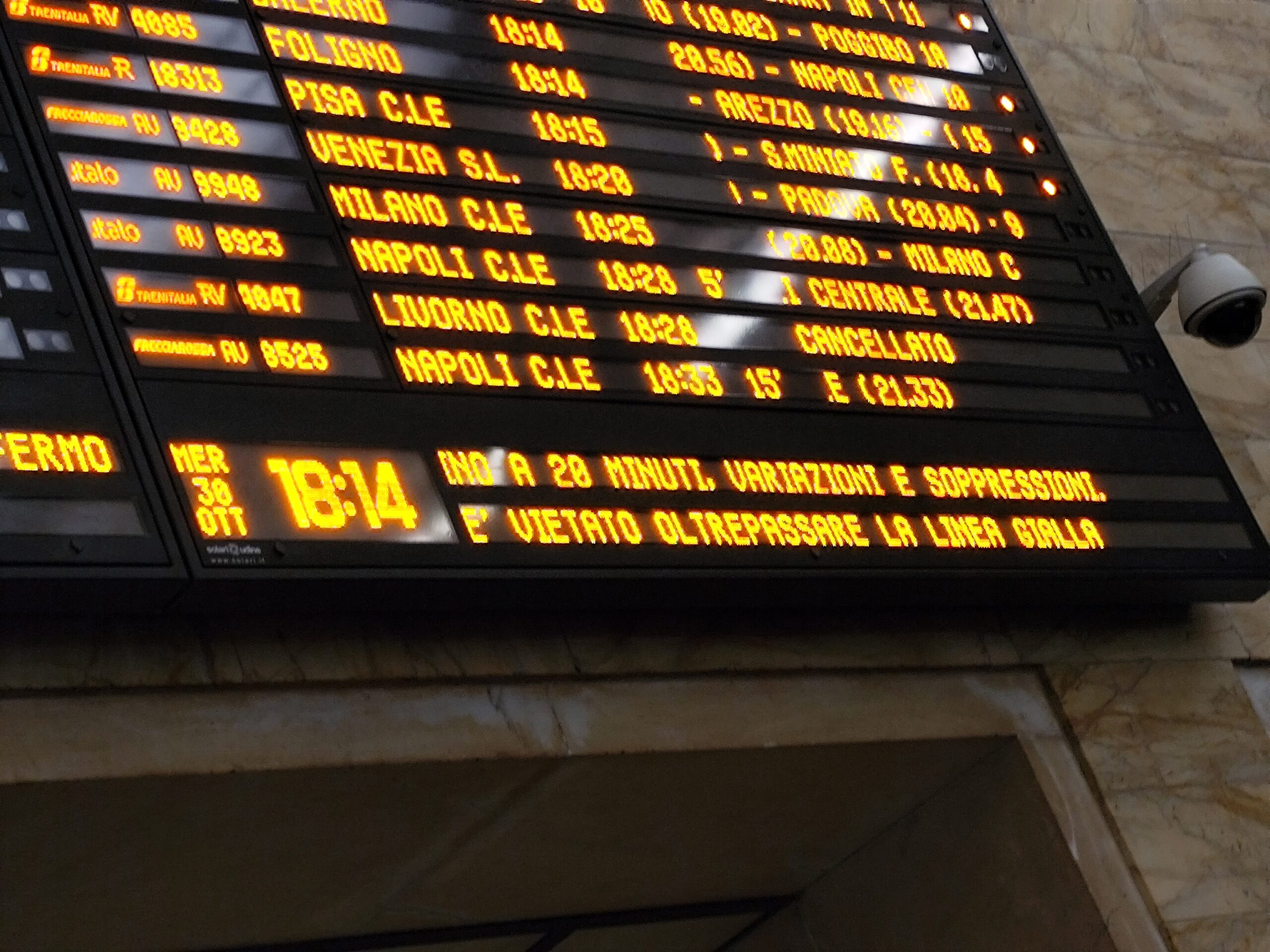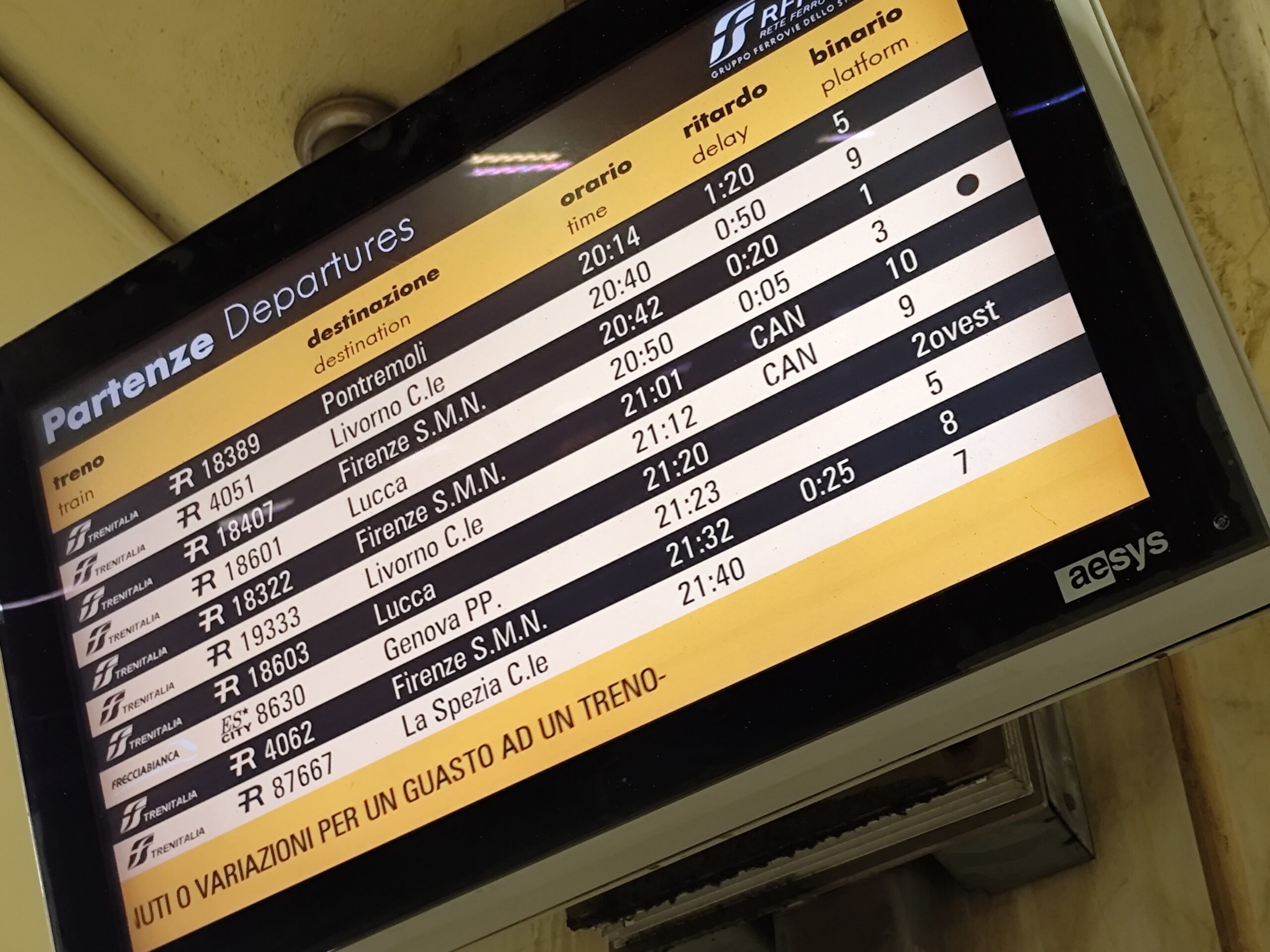 Y aquí llegó la parte que no estaba en el guion. Salimos de Boboli ya de noche, con el plan clásico: cruzar hacia Santa Maria Novella, tren a Livorno, bus a casa, cena, cama. Llegamos a la estación con tiempo de sobra. El tren se retrasó. Y se retrasó. Y se retrasó otra vez. Después de cambiar de andén un par de veces, al final salió un tren que llegaba hasta Pisa, y a Pisa nos fuimos pensando en enlazar con el siguiente a Livorno. Pero cuando llegamos, el último había salido y ya no había nada más esa noche. Puntuación del día: diez al David; cero a Trenitalia.