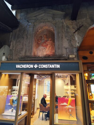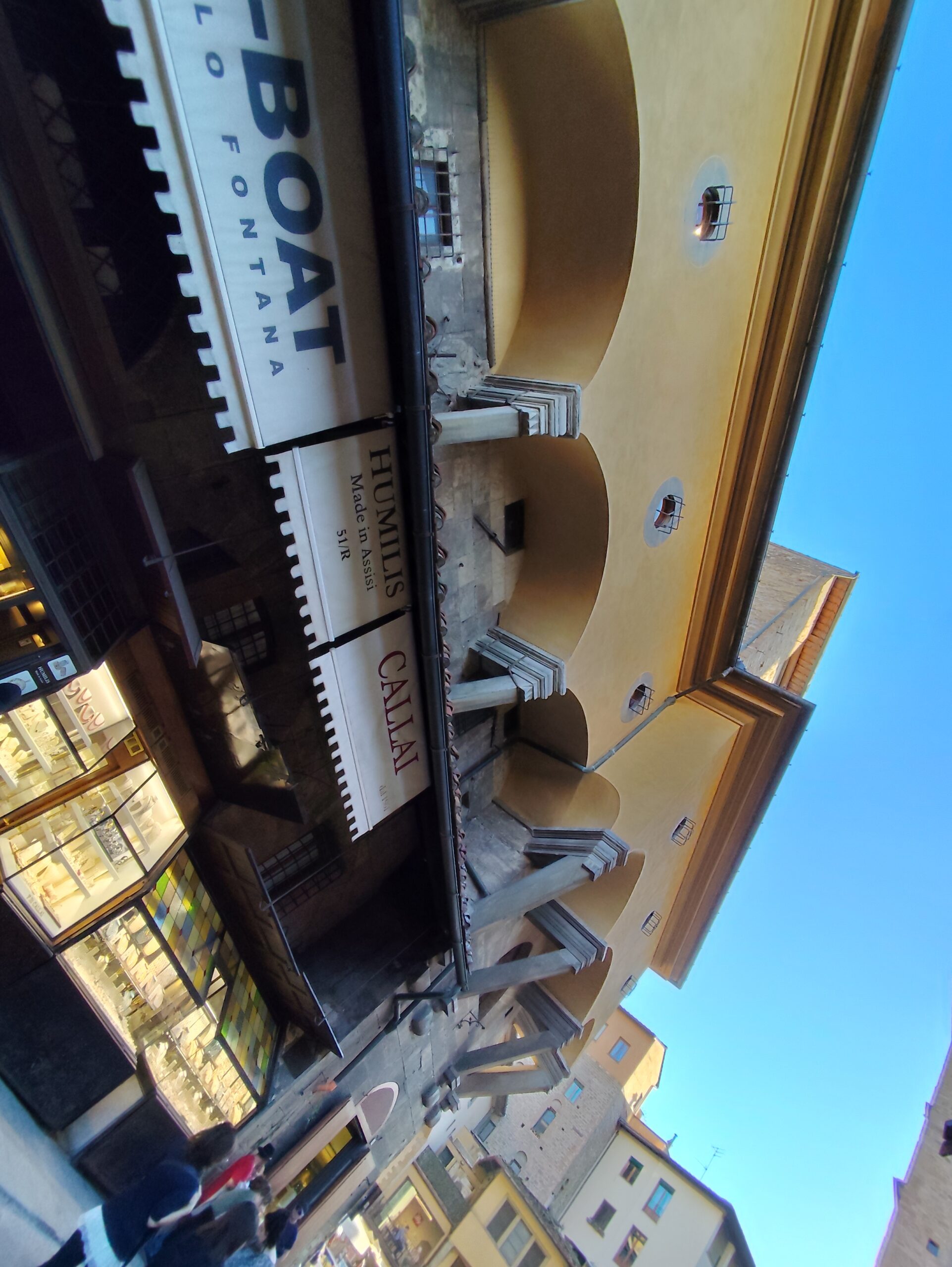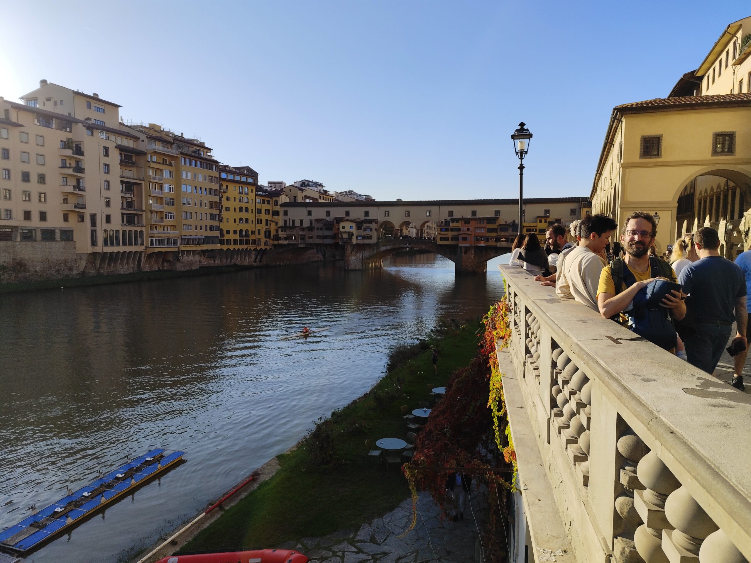 Con el estómago lleno, tocaba cruzar al sur del río. Paseo hasta el Ponte Vecchio, el puente que cada uno había cruzado por separado hace sus buenos años, pero nunca juntos. Sigue igual que en el recuerdo: apretado de gente, flanqueado por joyerías colgadas sobre el Arno, con ese aire de decorado que, contra pronóstico, no pierde el encanto. Estuvimos un buen rato mirando escaparates, sin prisa — esta vez éramos nosotros los turistas parados frente a las vitrinas — y, a falta de comprar nada, cruzamos al otro lado rumbo al Palazzo Pitti.