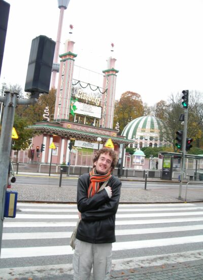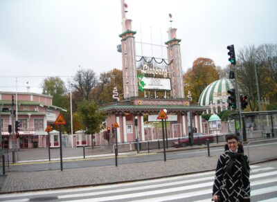 Nos contentamos con pasear por fuera de la entrada principal — el arco de Liseberg con sus torretas verdes y rosas, el cartel luminoso apagado, la cabina de entradas cerrada — y hacernos las fotos típicas de «estuvimos pero no entramos». Nagore posó bajo el arco, ensayando la sonrisa del que hace de visitante por obligación.