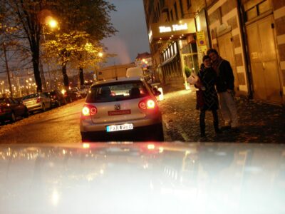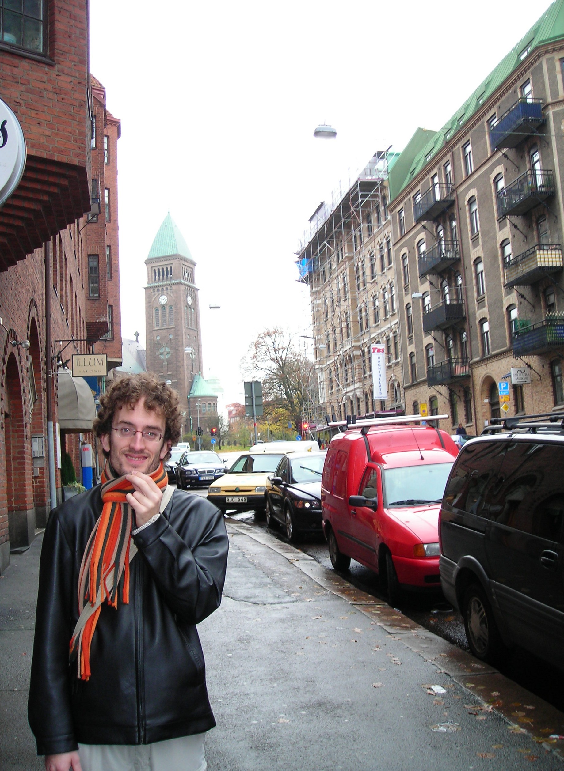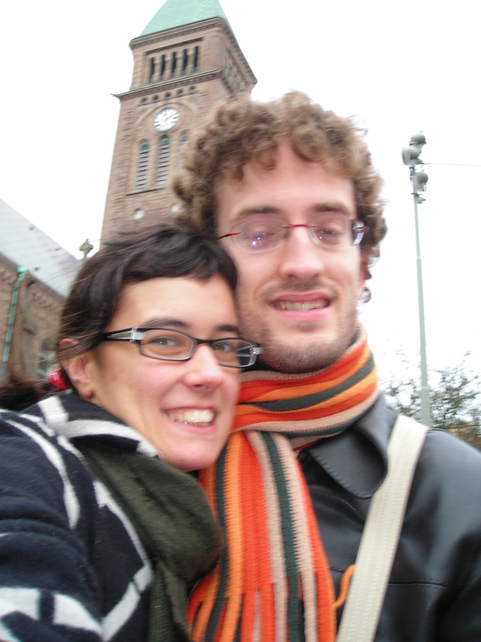 De ahí callejeamos un rato más por Kungsgatan y los pasajes peatonales del centro viejo, con las primeras luces de la tarde ya encendidas. Volvimos al Rica Hotel (hoy rebautizado como Scandic, que compró la cadena) por las calles ya mojadas del centro, y aprovechamos la última noche para otra de esas sesiones de fotos caseras muy de 2007 — cámara apoyada en cualquier sitio, temporizador, los dos apretujados para entrar en el encuadre.