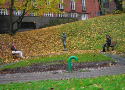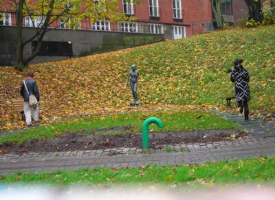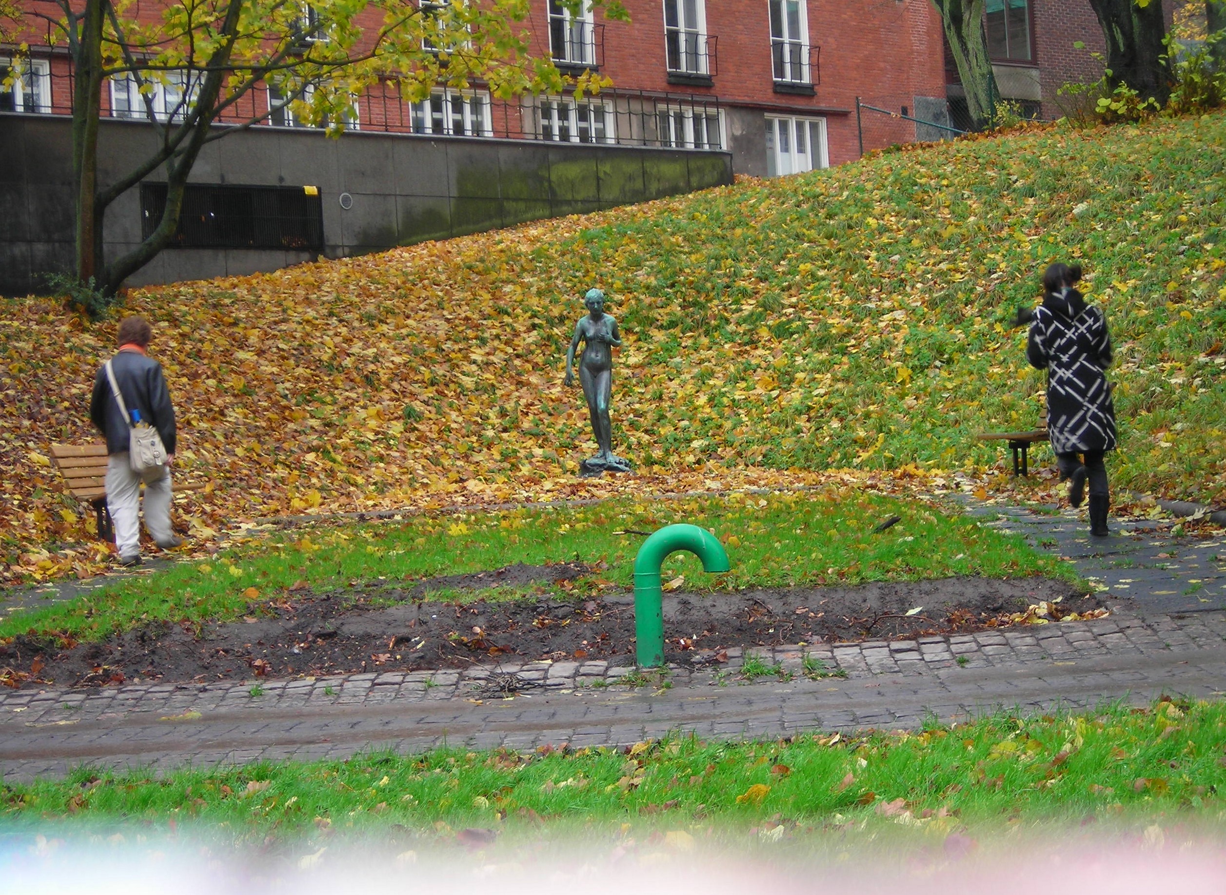 Bajamos hacia el centro por el cinturón verde de Kungsparken, el parque que sigue la vieja muralla del foso defensivo (Vallgraven) y que junto con el Trädgårdsföreningen rodea casi todo el casco antiguo. Atravesamos una zona con esculturas en las laderas llenas de hojas — recuerdo un desnudo de bronce sobre la hierba y una tubería de drenaje verde chillón que salía del suelo. A Nagore se la ve sentada en un banco al fondo, yo en el de enfrente; debieron ser dos minutos de descanso.
