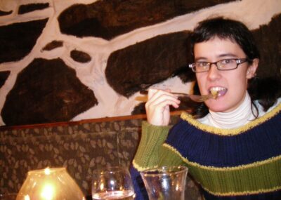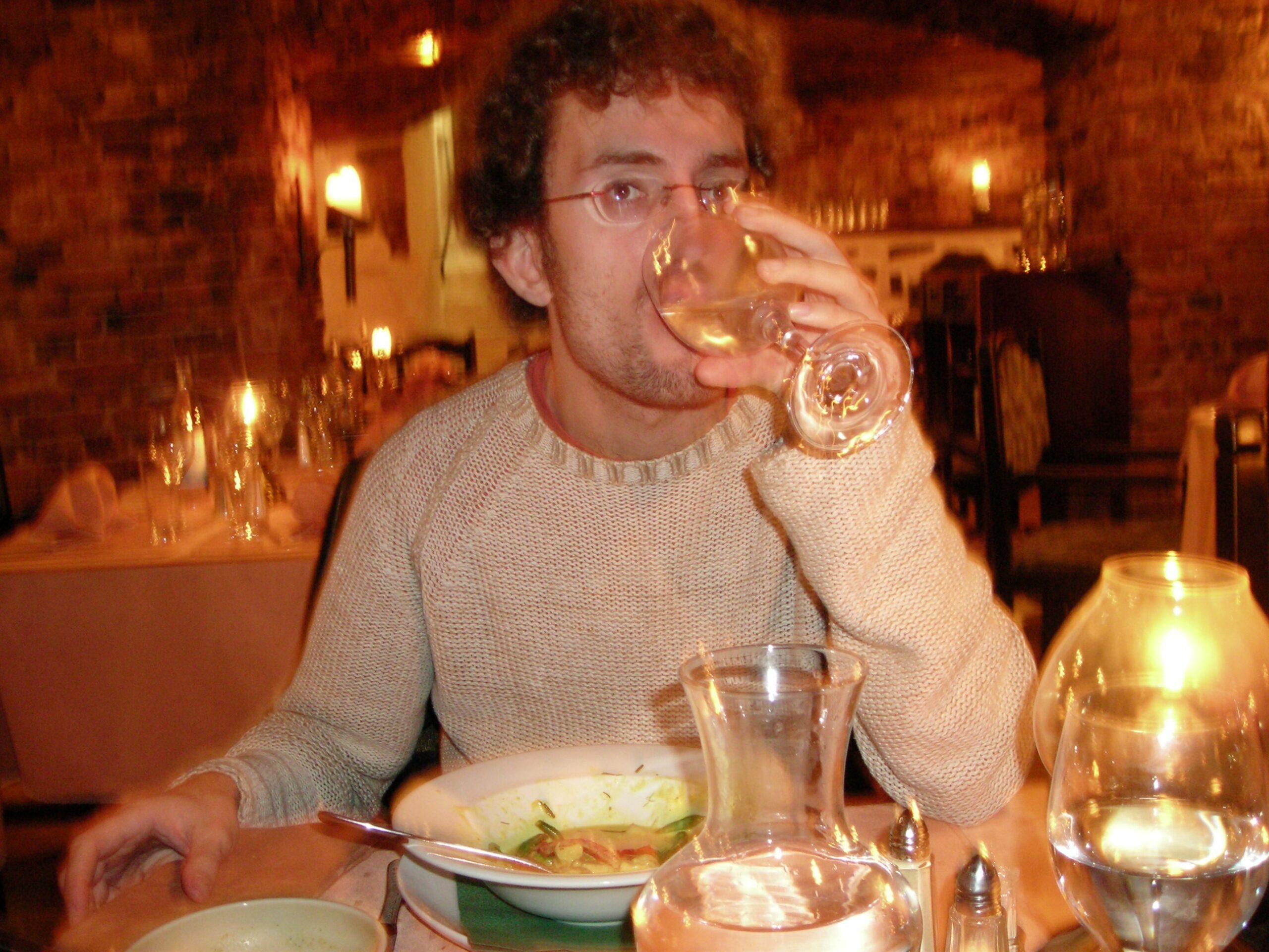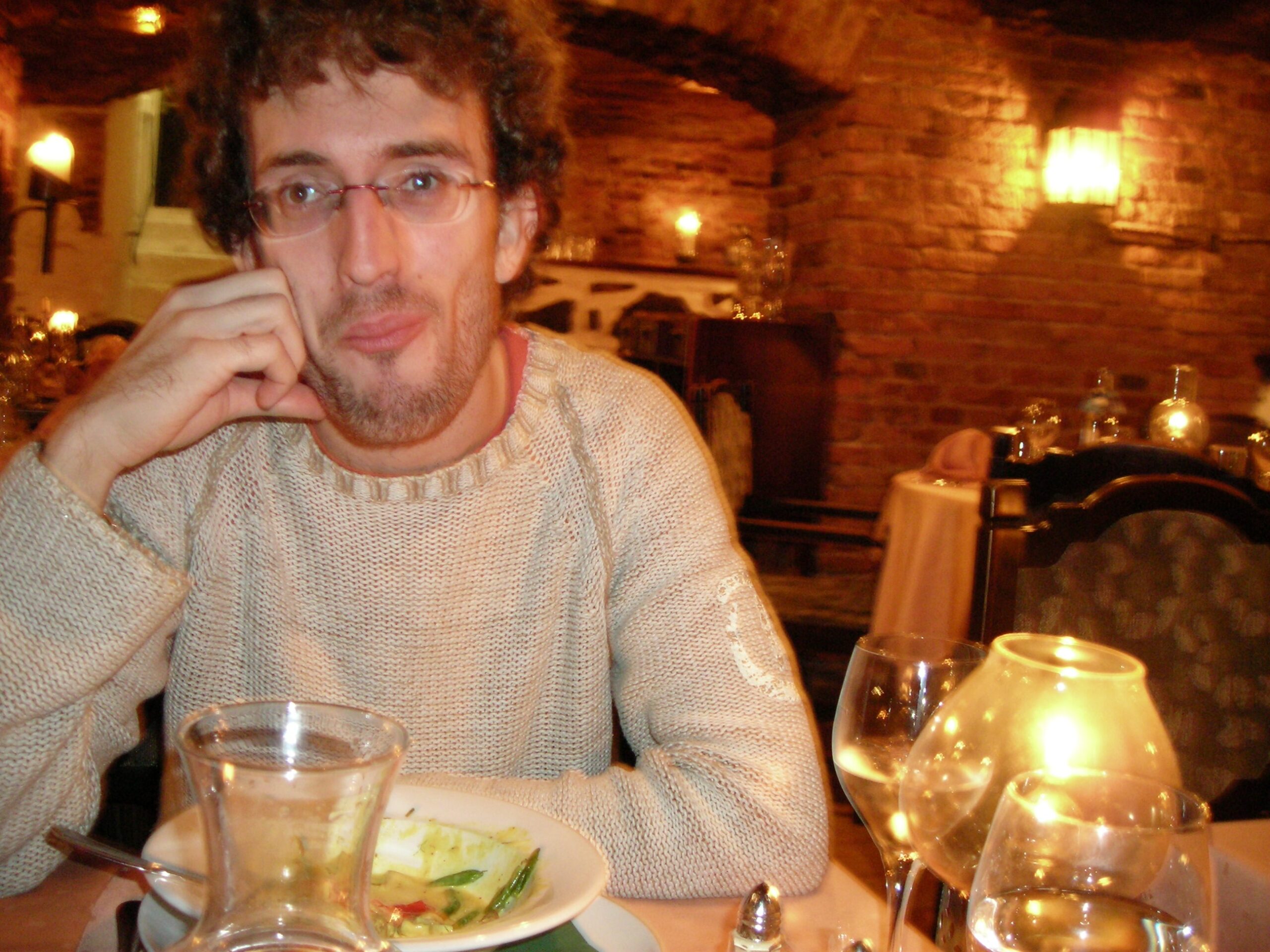 Para comer caímos en lo que parece una especie de bodega subterránea — un sitio con arcos de ladrillo vistos, velas, manteles largos y luz cálida — en una calleja del centro viejo. No recordamos el nombre, pero probablemente en la zona del barrio Inom Vallgraven, cerca de Magasinsgatan o Kyrkogatan, que es donde se concentran este tipo de restaurantes en bóveda. La comida salió rica, aparecemos los dos comiendo, brindando, bebiendo vino blanco, con esas fotos de pareja al inicio de la relación :-).