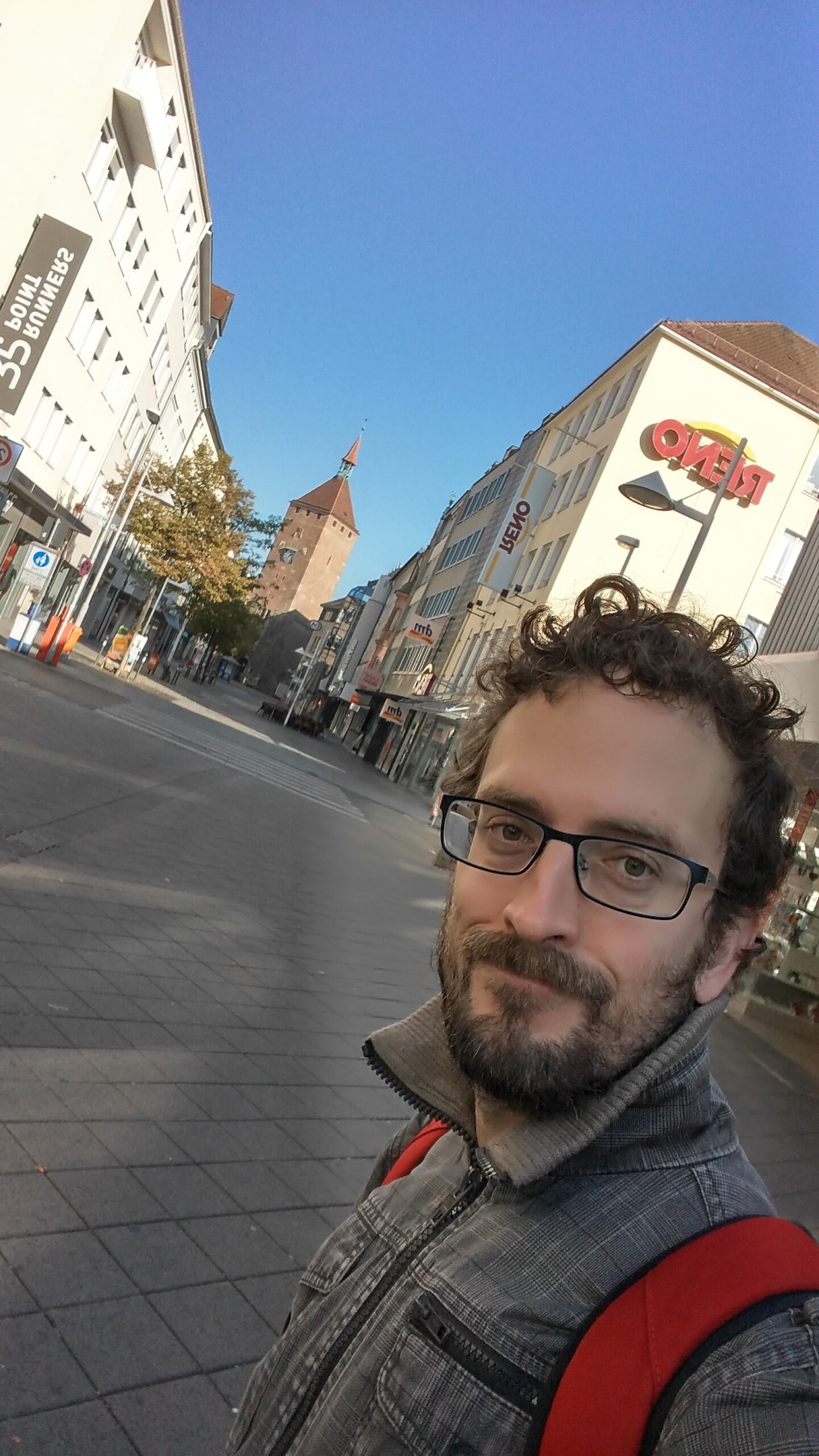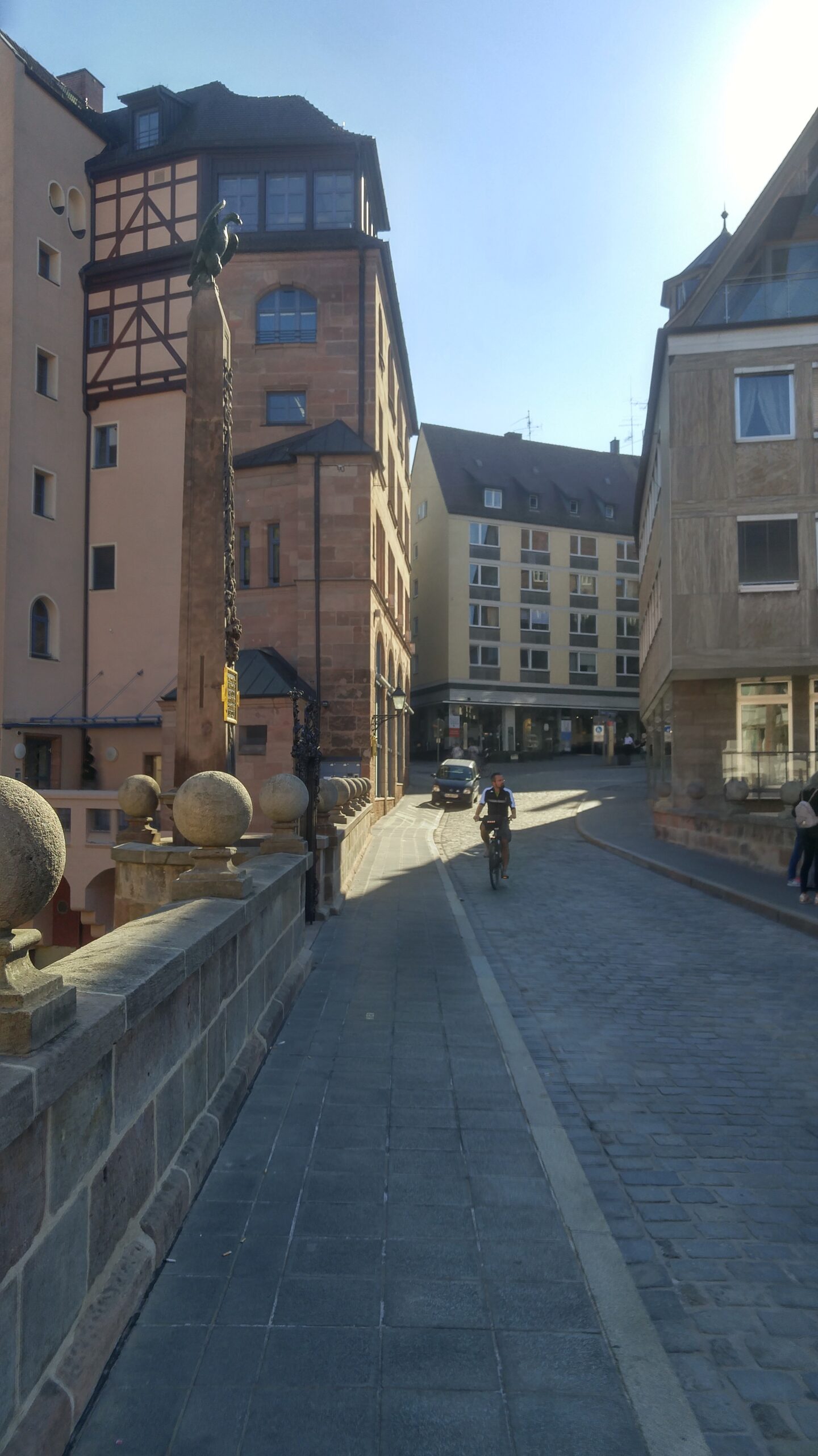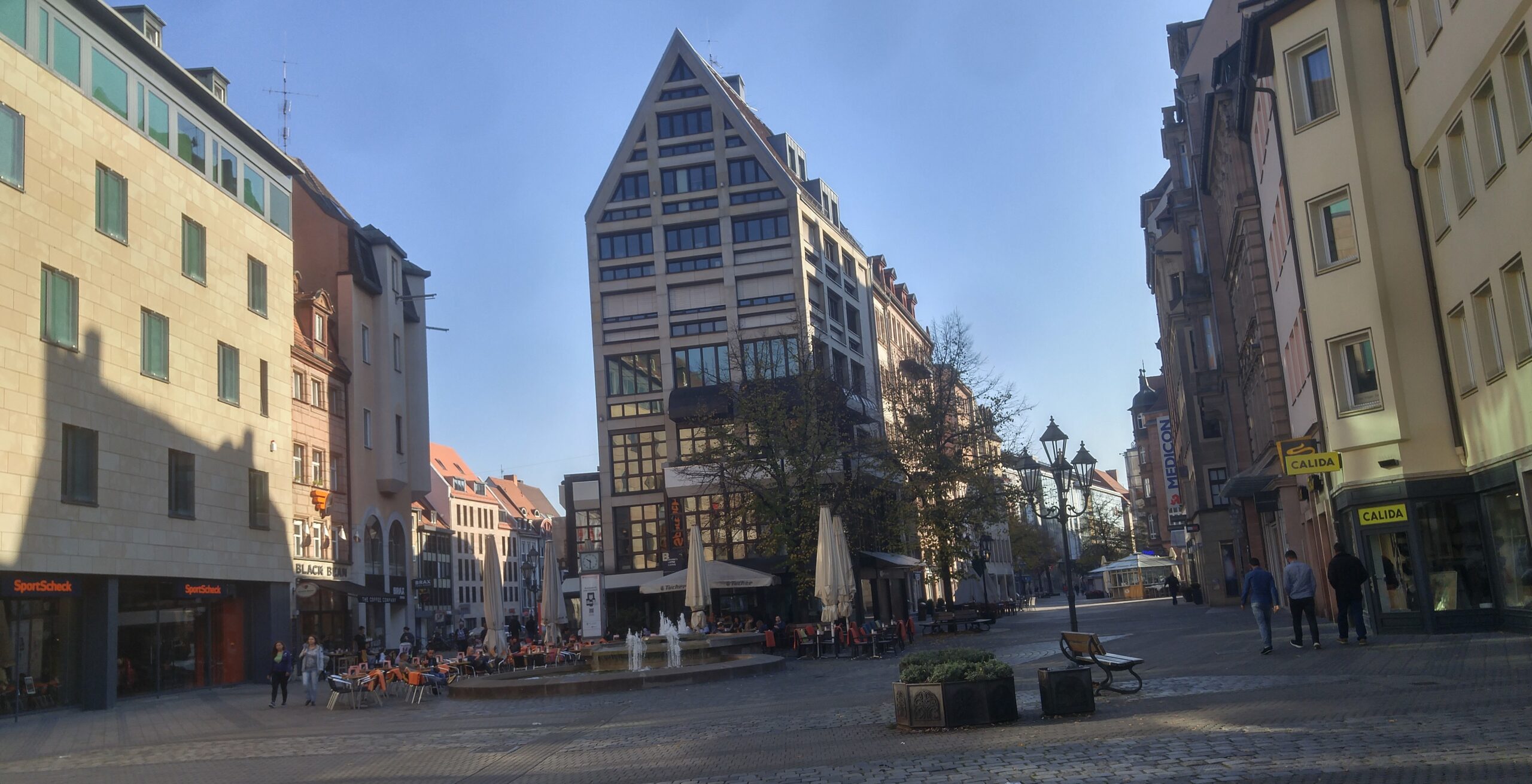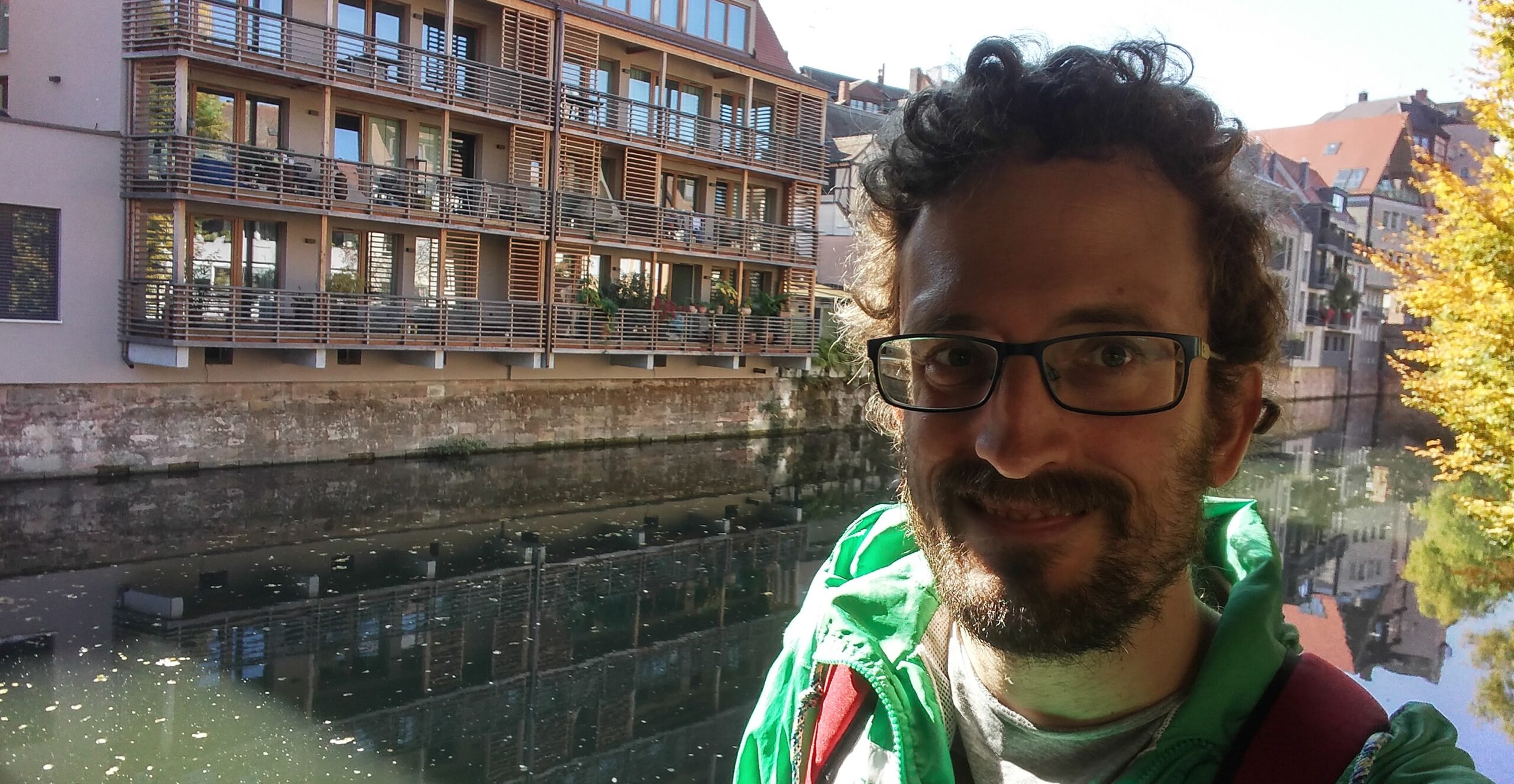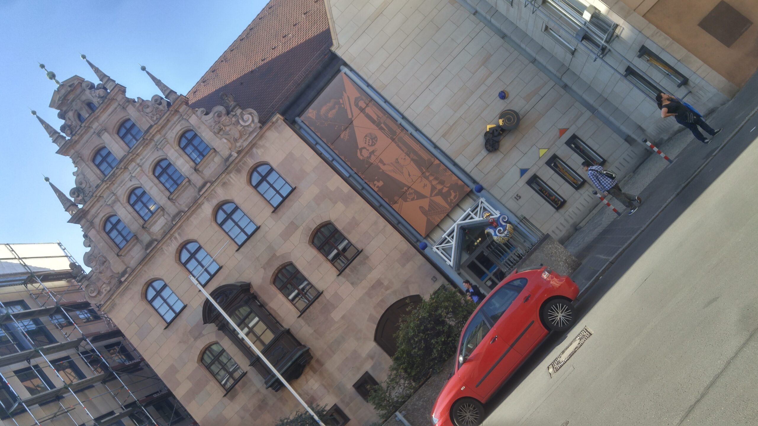 El edificio único acabado. Núremberg fue destruida en un 90 % por los bombardeos aliados de enero y febrero de 1945. Tras la guerra se decidió reconstruir el casco antiguo en su forma original, edificio por edificio, con piedra arenisca rosa de la cantera local. La excepción es la fachada del Schauspielhaus —el teatro municipal— que aparentemente quedó prácticamente intacta y fue uno de los pocos edificios públicos que NO necesitó reconstrucción. Vittorio nos lo señaló como anécdota y como prueba de la fragilidad del bombardeo: dos calles por allá, el edificio está entero; dos calles por aquí, todo era ruina. Esa arbitrariedad de la guerra es una de las cosas que más impresionan caminando por una ciudad reconstruida.