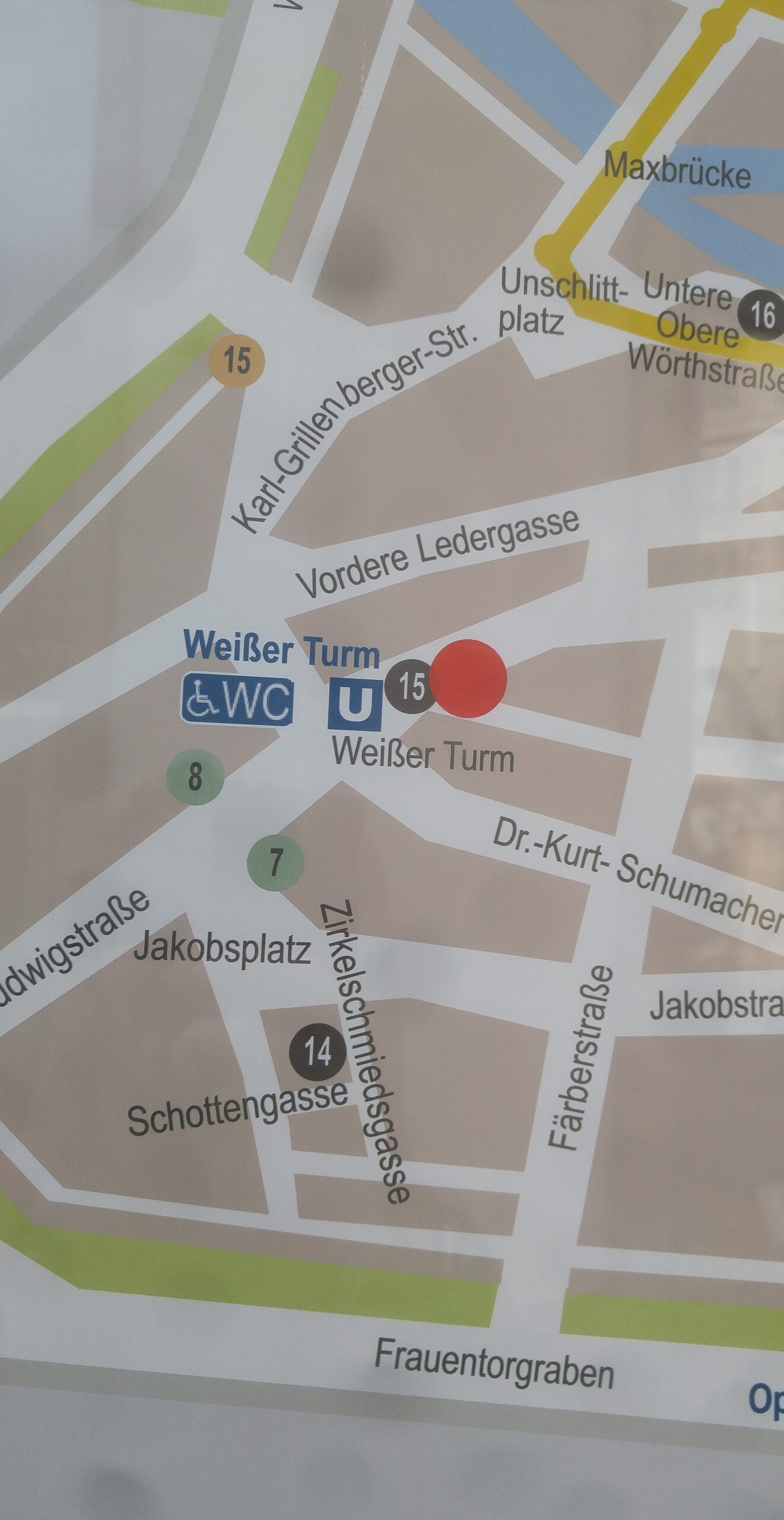 Bajé de la pensión hacia el Hauptmarkt por la calle ya familiar de la Leopoldstraße y, tras desayunar, me planté en la plaza del mercado donde había quedado el grupo del free tour. El guía se llamaba Vittorio, de los mejores guías de free tour que he tenido en mis viajes, mucho mejor que el de Berlín… recuerdo cosas muy interesantes que nos contó