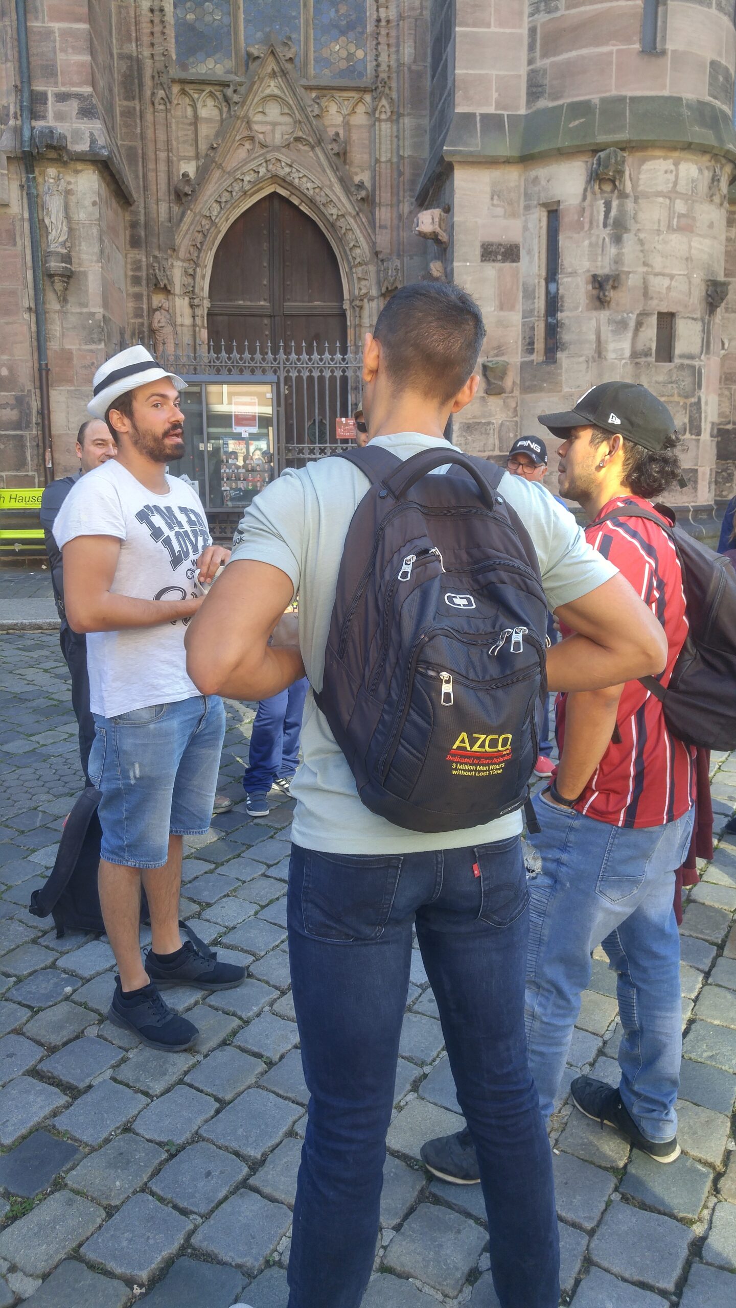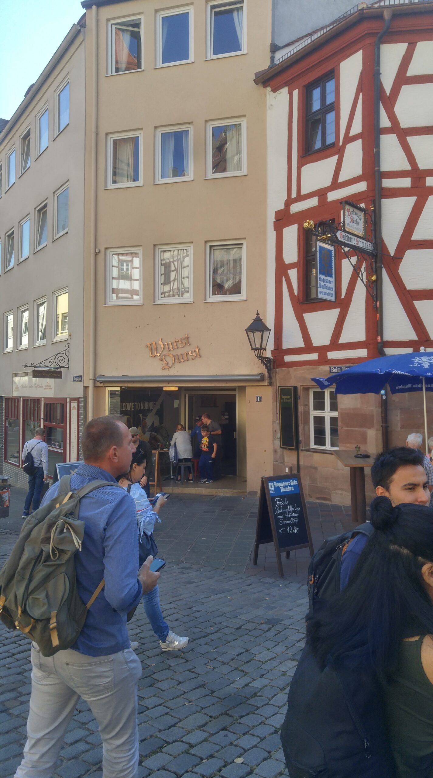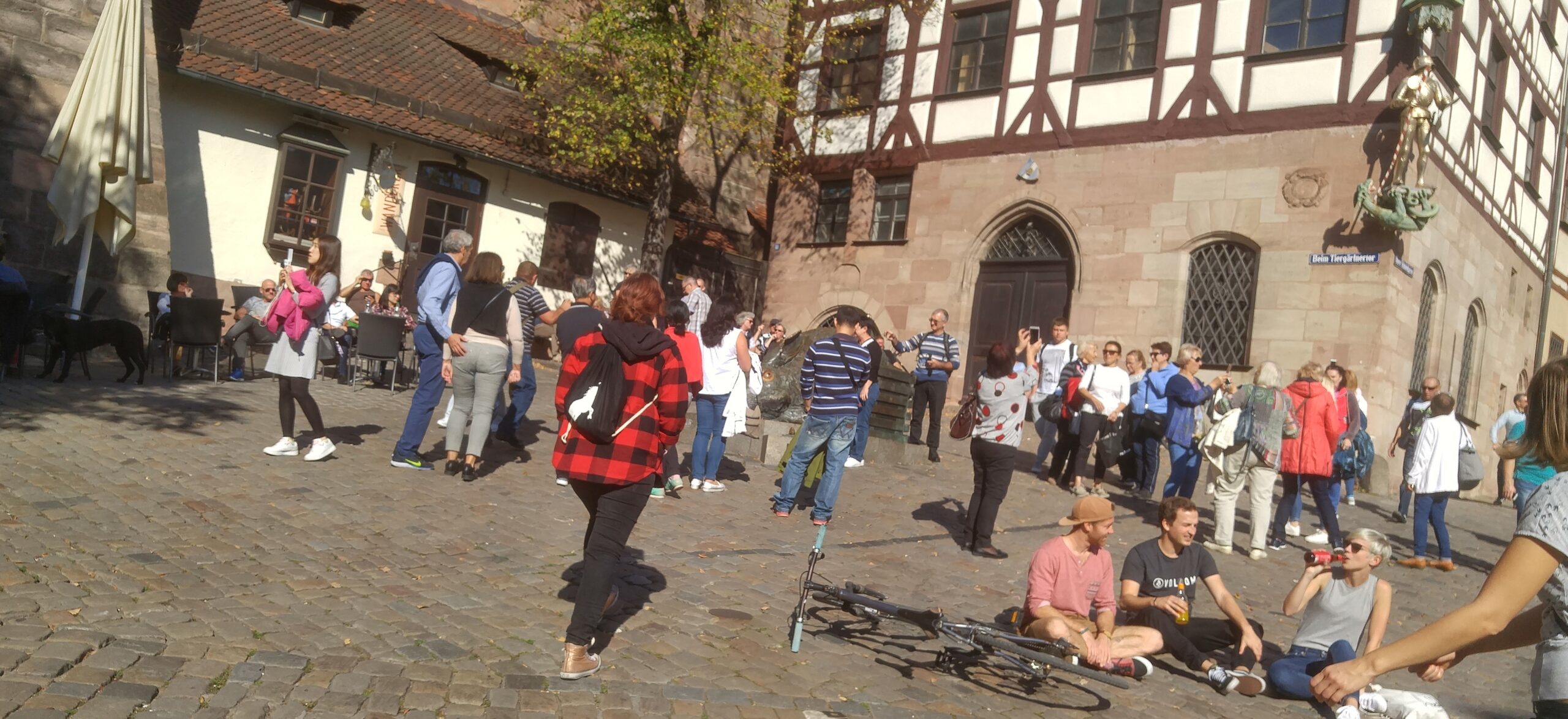 El pogromo de 1349 y la plaza del mercado. En el año de la Peste Negra la población de Núremberg, como tantas ciudades europeas, culpó a la comunidad judía local del contagio. Unas 560 personas fueron asesinadas en diciembre de 1349 y la sinagoga, que estaba justo donde hoy está la Hauptmarkt, fue derribada. El emperador Carlos IV —que había firmado un permiso explícito al Ayuntamiento para «hacer lo que considerasen necesario» con la propiedad judía— mandó construir sobre el solar la actual plaza del mercado y la Frauenkirche (Iglesia de Nuestra Señora). Es uno de los pasajes más oscuros de la historia urbana de Europa central, y la ciudad lo reconoce hoy con una placa discreta en una esquina de la plaza. Vittorio paró el tour ahí cinco minutos.