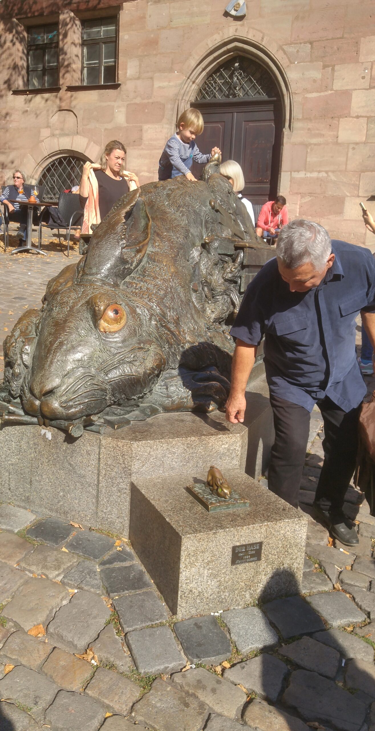 Y la estatua de la Liebre de Núremberg) de Jürgen Goertz —la escultura monumental de bronce de 1984 inspirada en la Liebre joven que pintó Dürer en 1502—, situada en la Tiergärtnertorplatz delante de la casa de Dürer: la pieza es deformada, oxidada, con la cabeza torcida y unas patas más bestiales que de liebre.