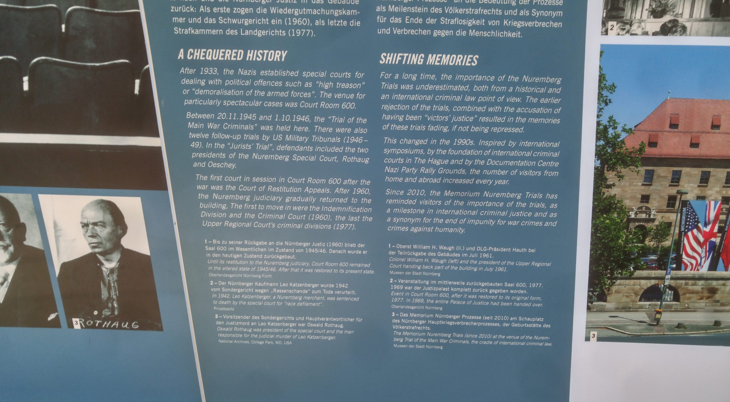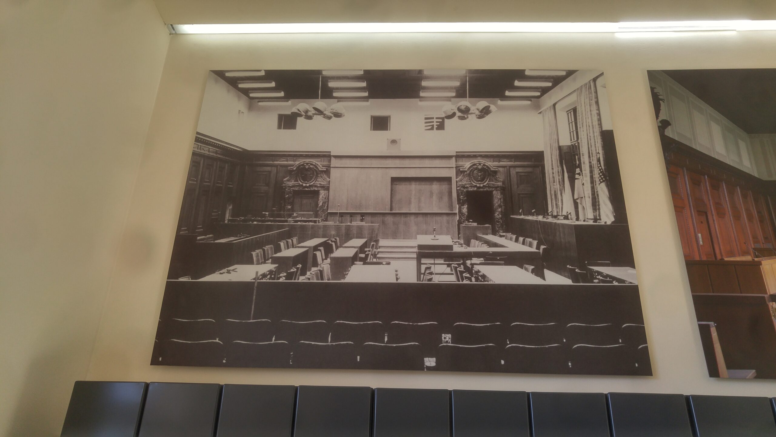La visita es de las que te recolocan: la sala 600 —la misma donde se sentaron Göring, Hess, Ribbentrop, Speer y los otros— se conserva con sus paneles de madera oscura, los micrófonos de baquelita, los auriculares de los traductores, los bancos del banquillo. La exposición arriba documenta la cronología, los acusados, las defensas, las sentencias. La crítica jurídica que mencioné en el bloque de arriba está bien presentada — el museo no escatima en el debate sobre el ex post facto.
